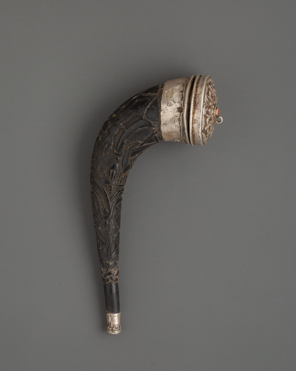 This Tibetan Snuff Horn is an example of traditional craftsmanship and creativity with spiritual significance. It is handcrafted from ethically sourced yak horn and features a finely carved pattern accented with pure silver and a brilliant coral inlay. Measuring 11 cm in height and 24 cm in breadth, the horn is a beautiful item and a valuable tool for spiritual rites. The coral, known for its healing properties, adds protection and vitality to the piece.