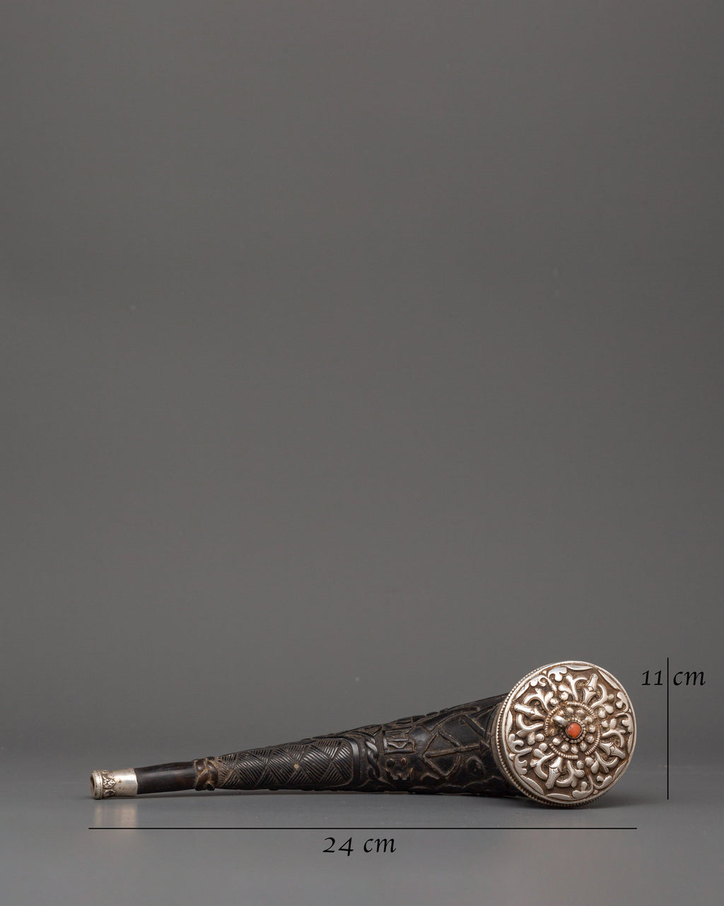 Whether displayed as a unique piece of spiritual decor or used in meditation and rituals, this Tibetan Snuff Horn with coral inlays is a remarkable addition to any collection. Its exquisite craftsmanship and profound significance render it a treasured possession for those who appreciate Tibetan culture, spiritual growth, and the art of spirituality.