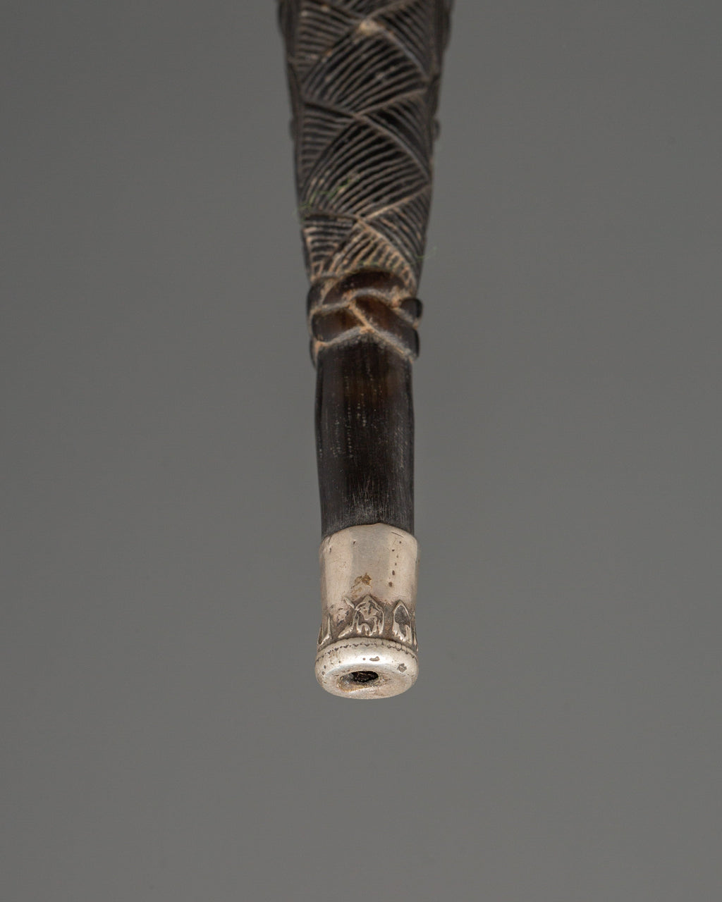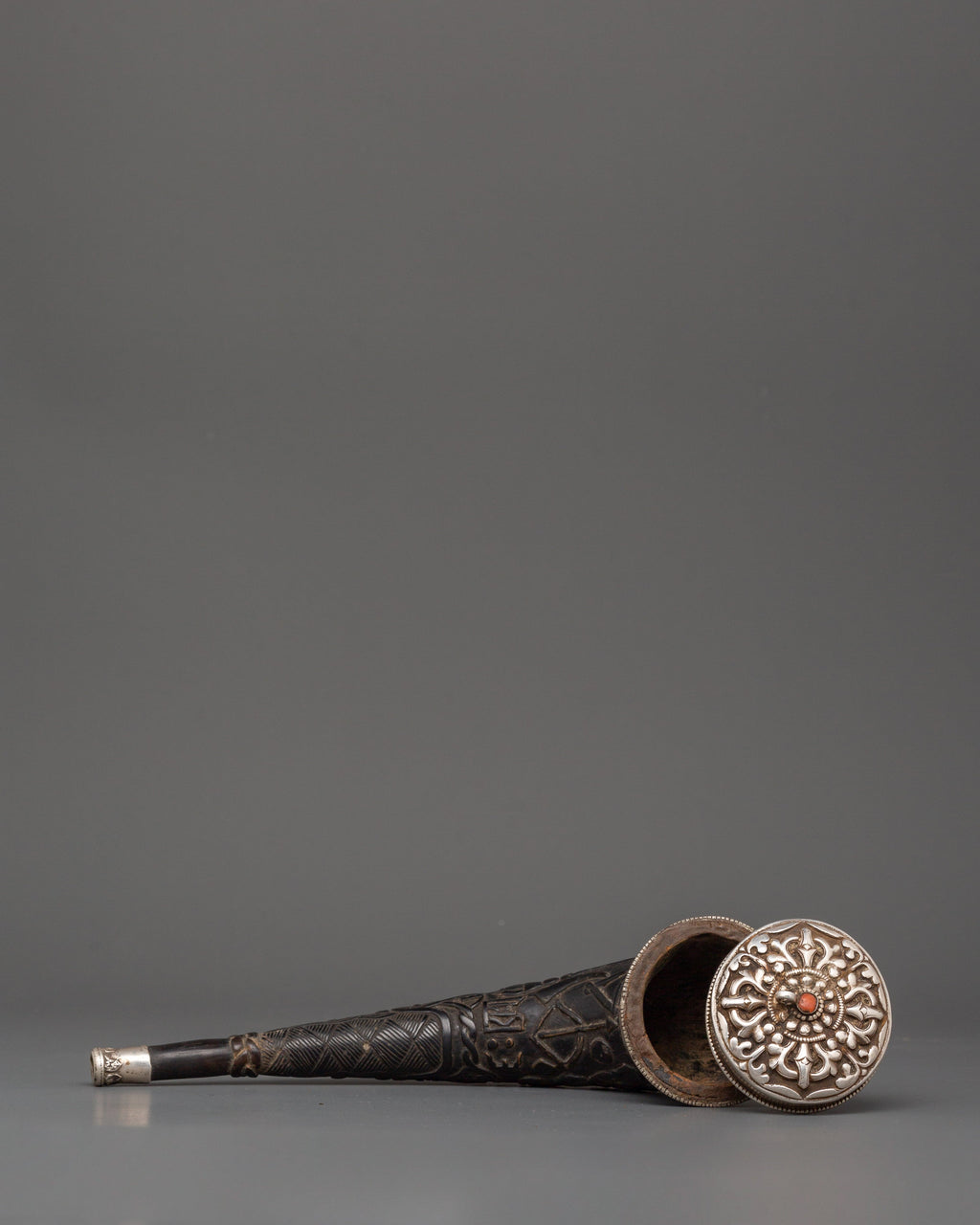 Tibetan and Himalayan cultures have long utilized snuff horns to store snuff during religious ceremonies or daily activities. This snuff horn is adorned with intricate silver work and coral stones, enhancing its visual appeal and spiritual significance. As you hold this snuff horn, allow the energy of ancient traditions to guide you on your spiritual journey. The yak horn, symbolizing strength and endurance, represents a deep connection to nature and the earth, making this piece a ceremonial instrument and a powerful spiritual companion.