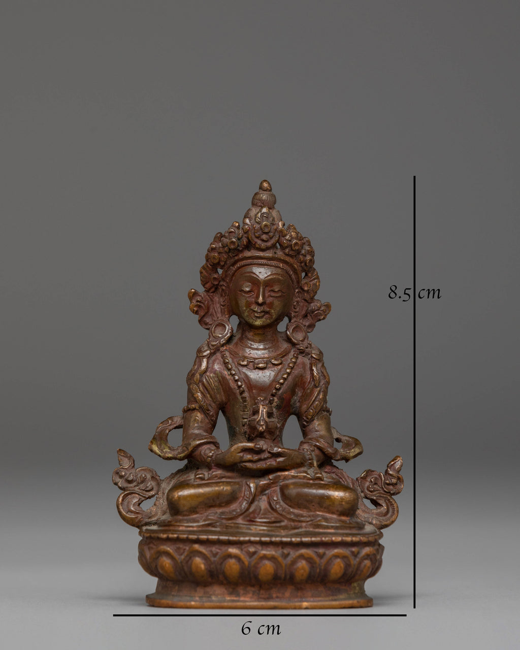 This Tibetan Statue of Amitayus is a beautifully crafted representation of the Buddha of Eternal Life. Standing at 8.5cm tall and 6cm wide, it is made from oxidized copper, giving the statue a rich, antiqued appearance that enhances its spiritual presence. Weighing 0.13kg, this statue has a light, perfect for altars, meditation tables, or as a centerpiece in your spiritual space.