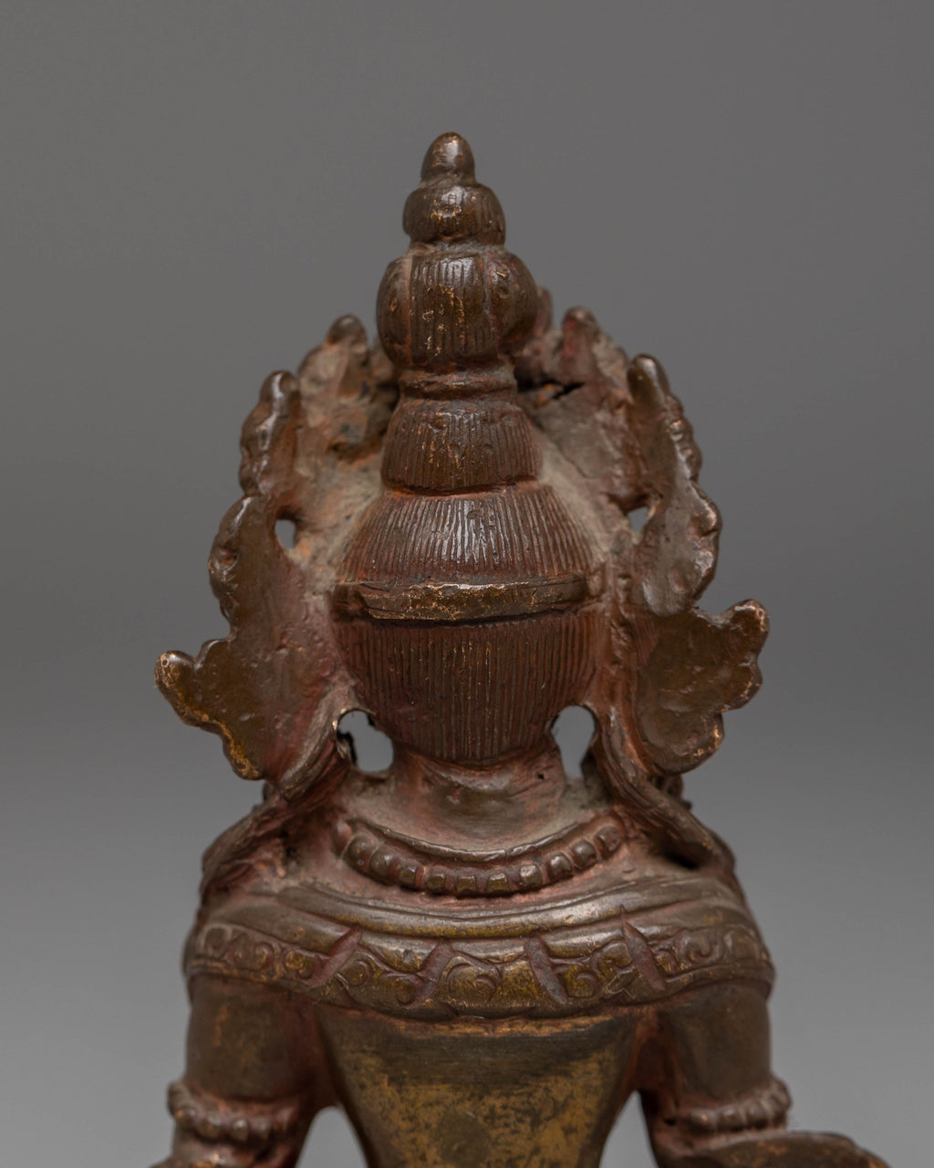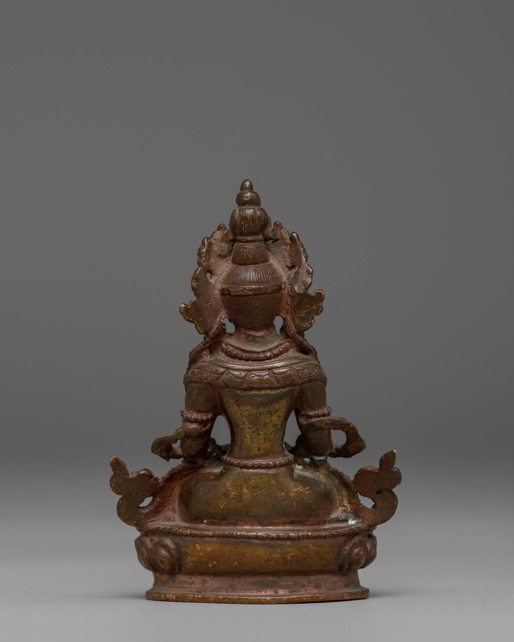 The statue captures Amitayus in a serene seated position, embodying the peace and calm that are central to his teachings. Detailed with traditional Tibetan motifs, including lotus petals and beads, the statue is imbued with symbols of life, purity, and prosperity. The figure’s graceful posture and the intricate detailing on the robes reflect the rich spiritual heritage of Tibetan art, while the oxidized copper finish adds depth and timeless beauty to the piece. Amitayus' serene face and peaceful expression are meant to inspire meditation and invoke divine blessings for long life and spiritual well-being.