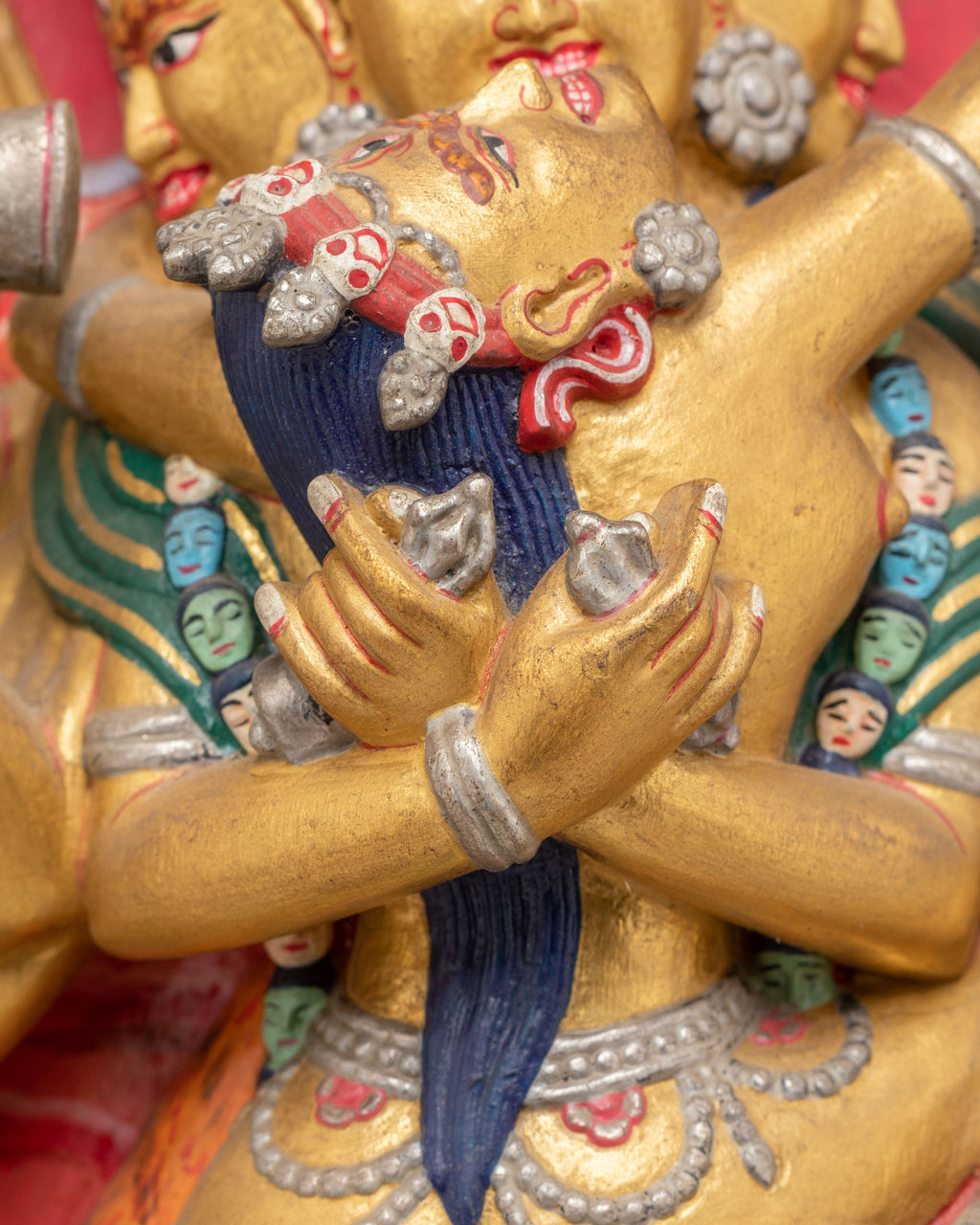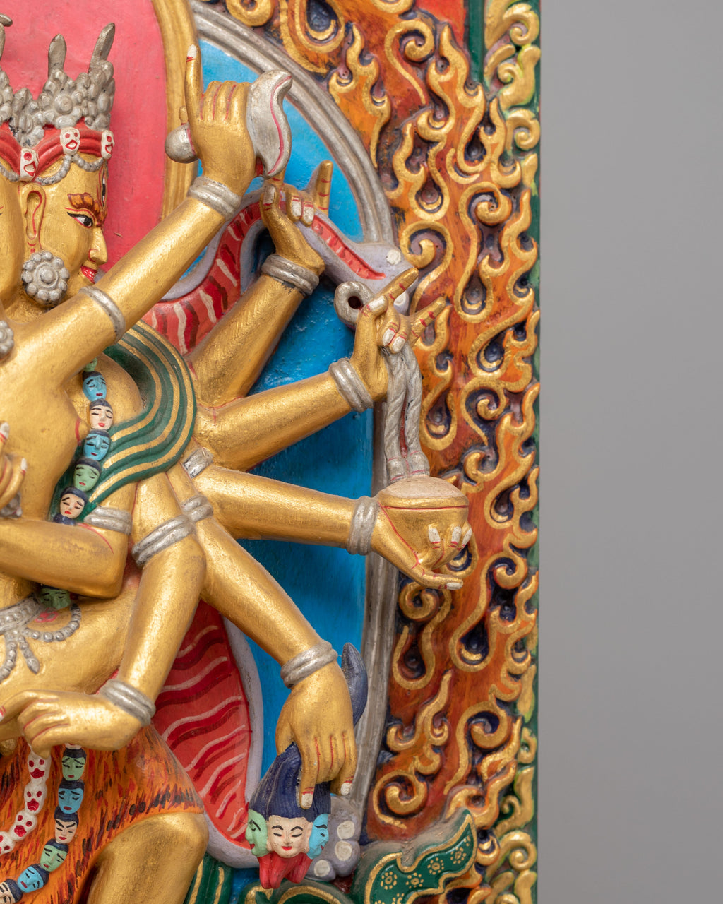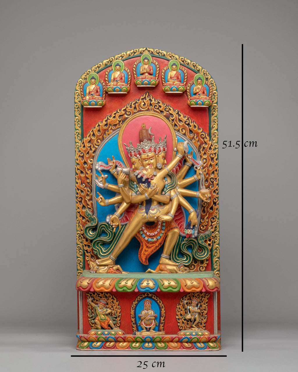 The Chakrasamvara statue features eight arms, each holding various symbolic objects, illustrating his ability to provide protection, spiritual guidance, and empowerment. The golden finish beautifully highlights the deity’s divine radiance, while the acrylic colors on the background and base add depth and vibrancy to the piece. The flame-like motifs surrounding the figures represent the transformative energy of Tantric practice, purifying obstacles and guiding practitioners toward enlightenment. The presence of more miniature Buddha figures above and below Chakrasamvara further emphasizes his connection to the broader spiritual universe.