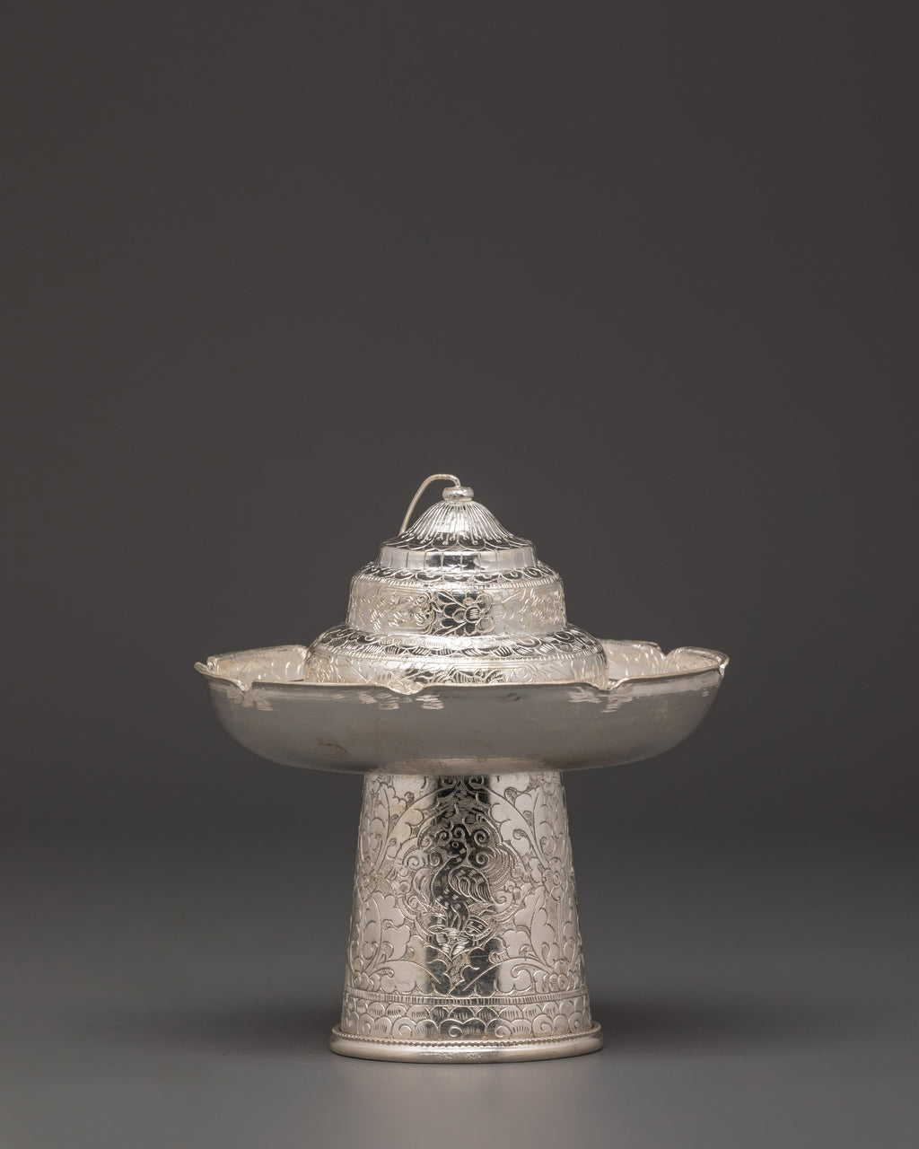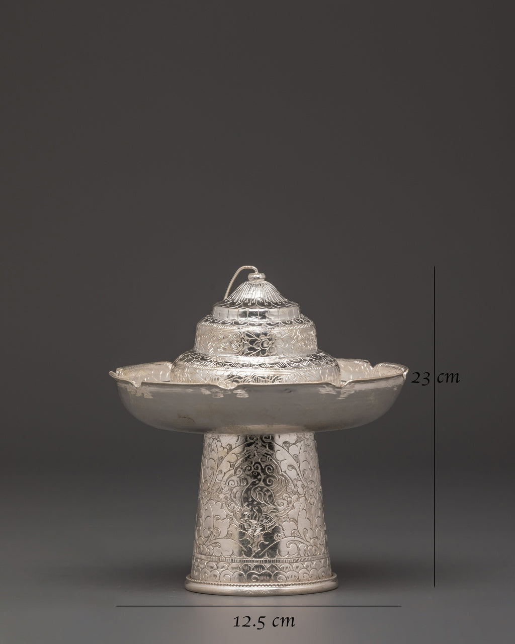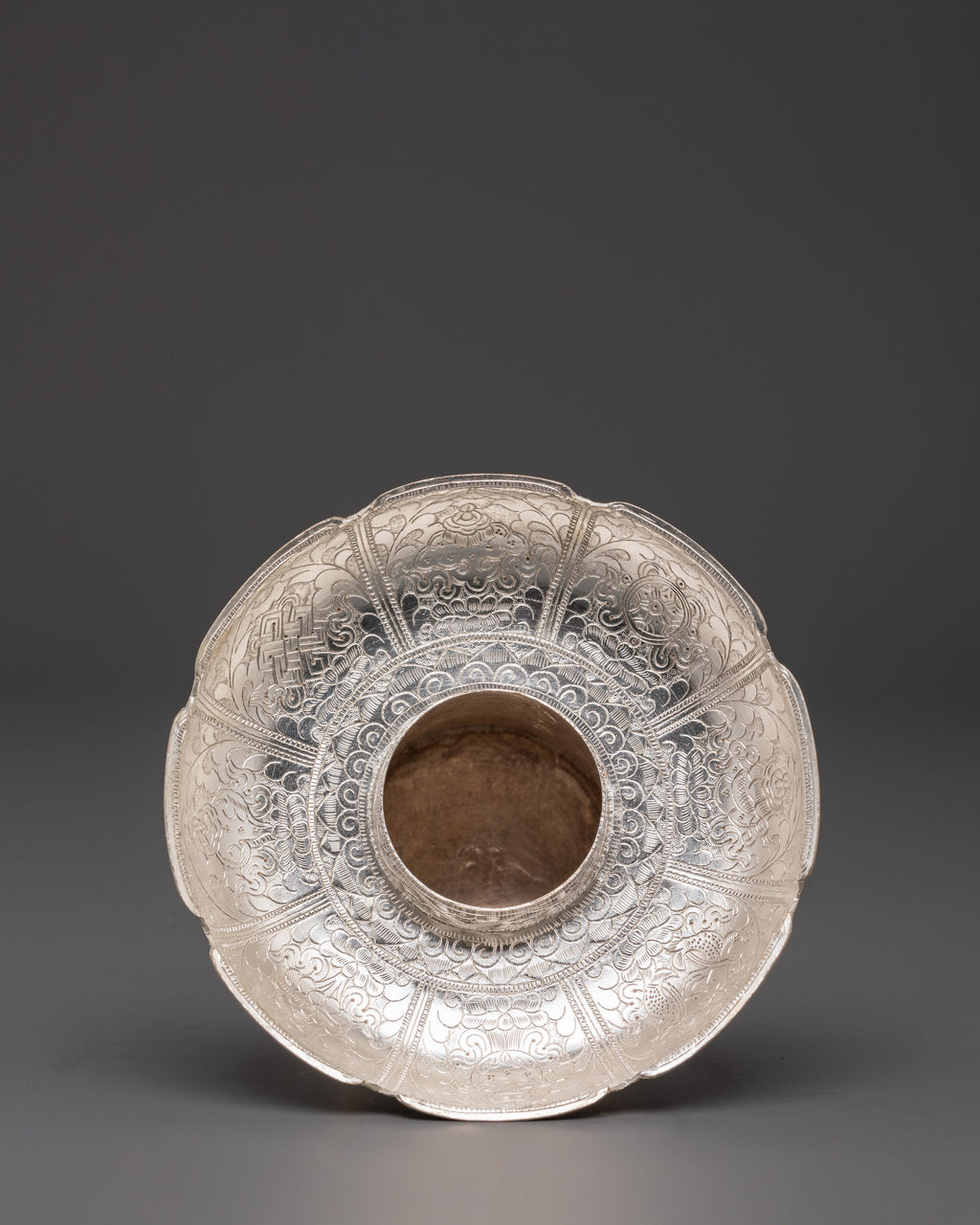 This Tibetan Tea Cup is a beautifully handcrafted piece designed to elevate your tea-drinking experience while connecting you to spiritual traditions. Made from copper and adorned with an elegant silver plating, this teacup measures 23cm in height and 12.5cm in width, with a weight of 0.33kg. Its size and craftsmanship make it perfect for both everyday use and special ceremonies, offering a blend of functionality and spiritual elegance.