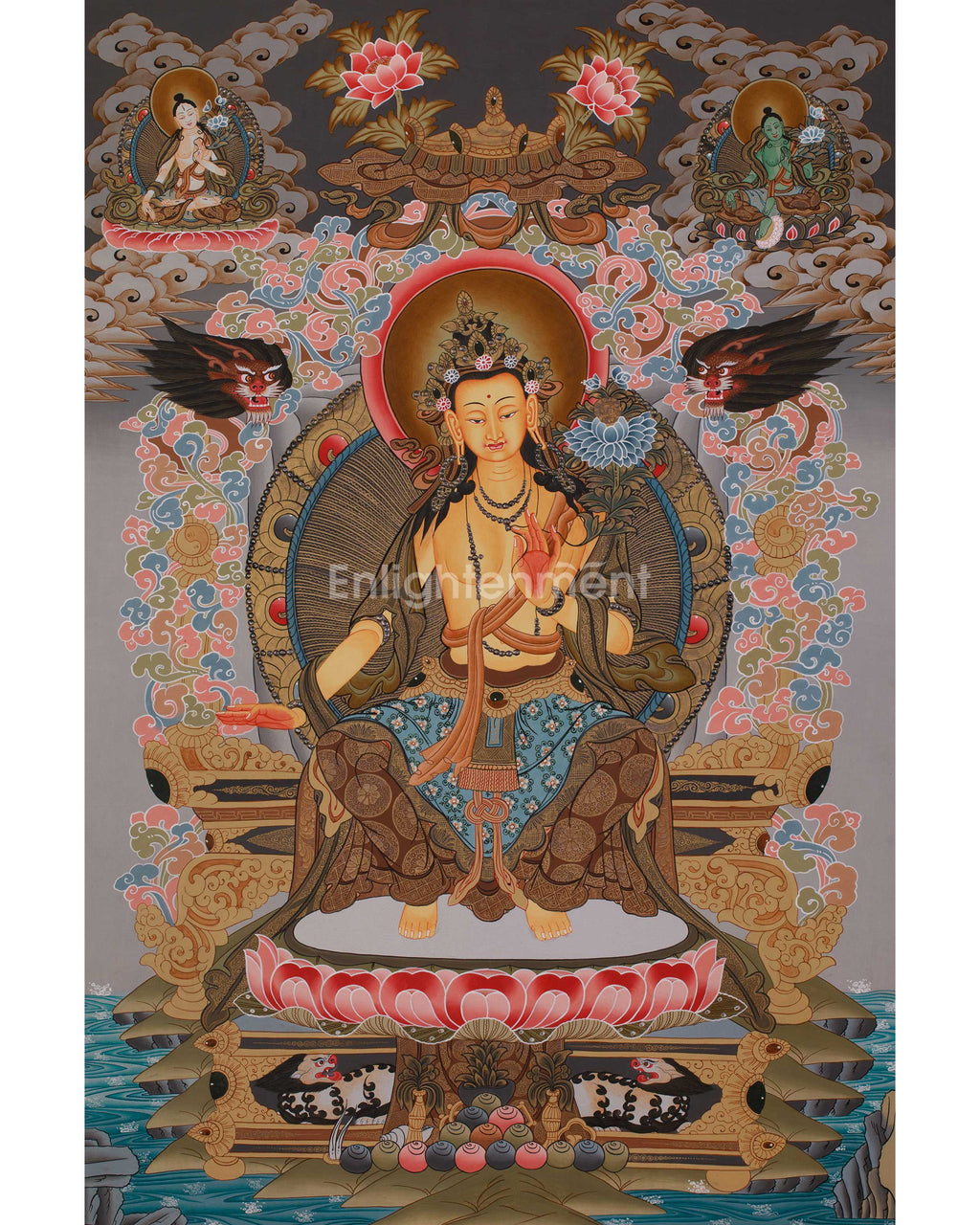 Maitreya Buddha, known as the "Future Buddha," is a key figure in Buddhist tradition. He symbolizes loving-kindness and is prophesied to appear on Earth, bringing an era of peace and enlightenment. His image is associated with hope and the fulfillment of Buddha’s teachings, representing qualities all beings can aspire to. In this thangka, he is accompanied by two revered Tara figures: White Tara, symbolizing compassion and offering healing and longevity, and Green Tara, embodying active compassion and protection, helping overcome obstacles and guiding. Together, they evoke compassion, protection, and future hope. This detailed thangka depicts Maitreya seated on a lotus throne, symbolizing purity and enlightenment. Surrounding him with sacred symbols like lotuses, clouds, and rivers representing spiritual harmony. Ideal as a meditation or altar piece, it fosters peace, compassion, and hope.