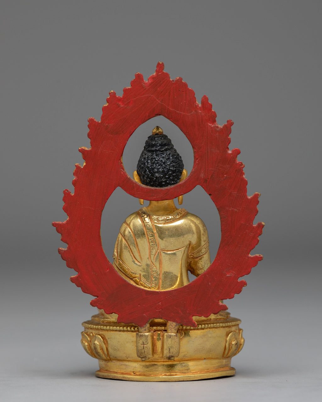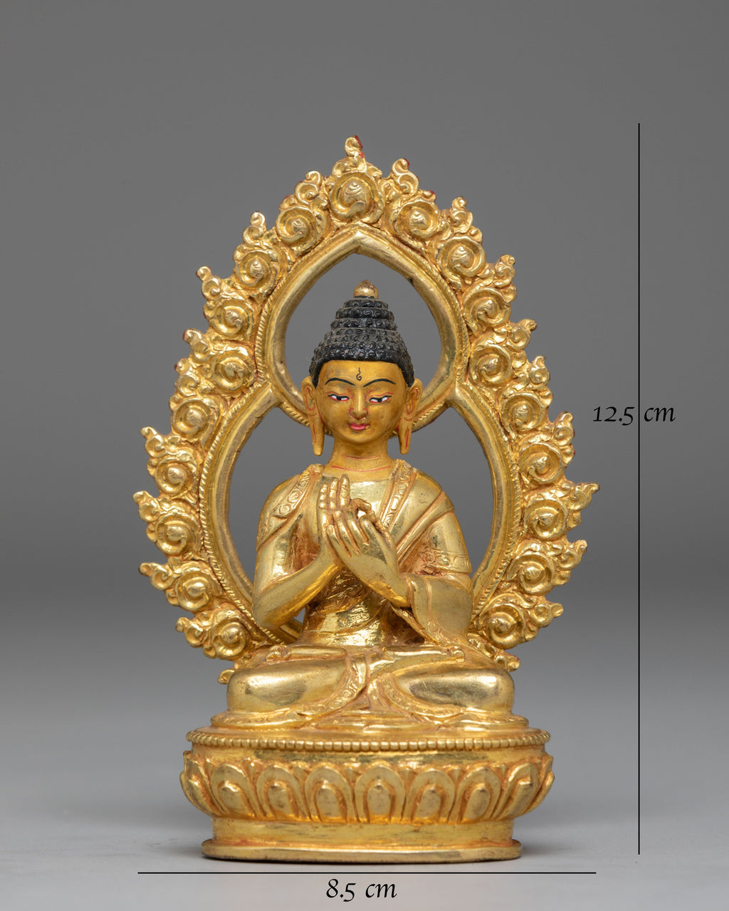 The statue features Vairocana seated in the dharmachakra mudra, symbolizing the turning of the Wheel of Dharma. The detailed facial expression, serene posture, and beautifully sculpted robes highlight the craftsmanship of traditional Himalayan metalwork. The ornate aureole surrounding the Buddha is adorned with layered motifs that evoke purity, radiance, and spiritual awakening. The gold-plated surface enhances the sculpture’s warm glow, making it a captivating centerpiece.