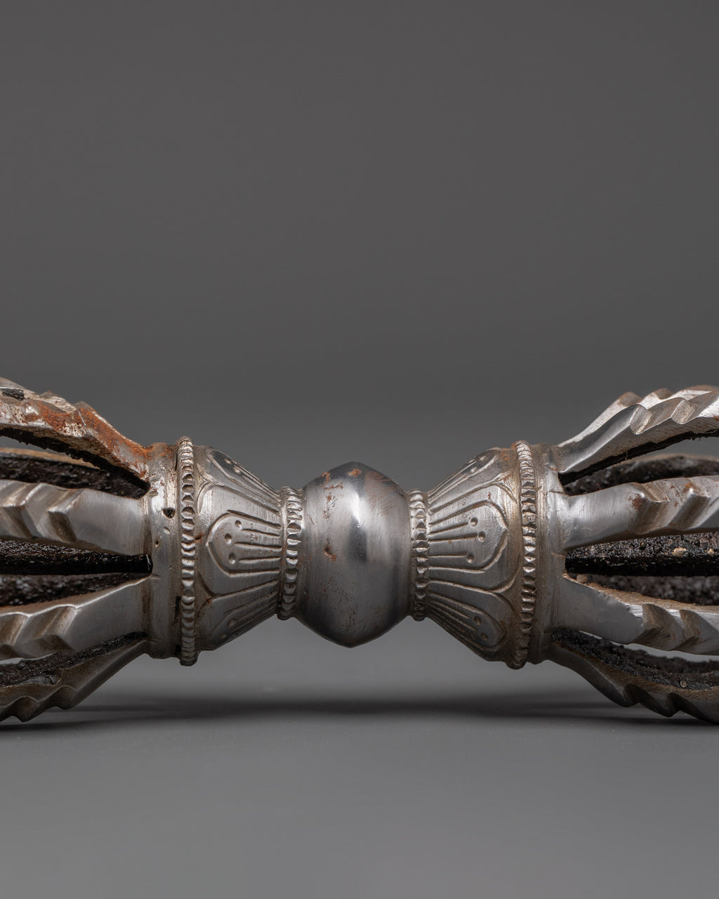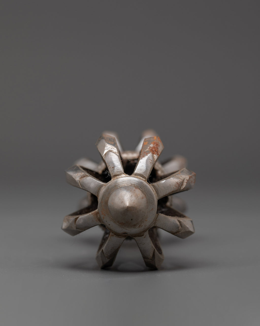 Designed with precision, the Vajra features multiple spokes that symbolize the fusion of wisdom and compassion. The Vajra’s form and motifs are rich in meaning, serving as a reminder of the power of clarity, insight, and compassion in overcoming ignorance and fear. In Tibetan Buddhism, the Vajra is a tool of transformation and purification, used to invoke spiritual strength and divine protection. Its iron body signifies not only its enduring strength but also its grounding and protective properties, helping to safeguard its owner from harm.