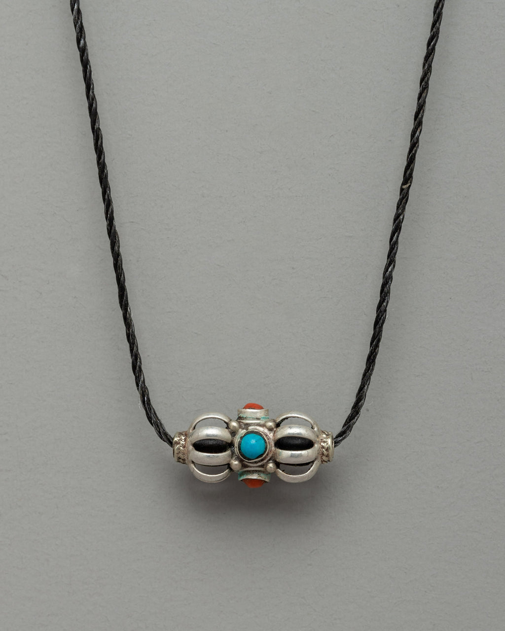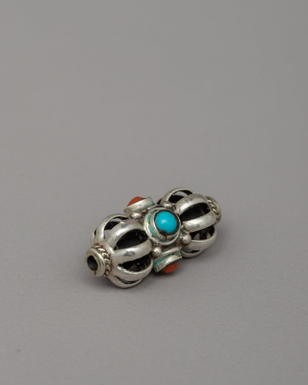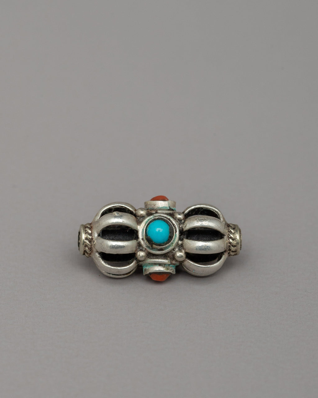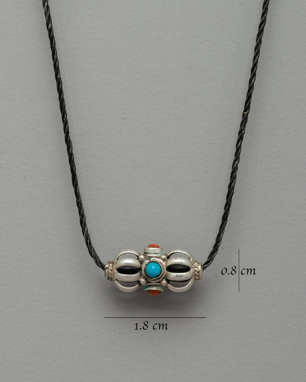 The Tibetan Vajra Locket is a small but exquisitely designed spiritual piece representing strength, protection, and the indestructible nature of enlightenment. This intricately crafted locket, measuring 1.8 cm in length and 0.8 cm in height, is made of silver and has vivid turquoise and coral inlays.