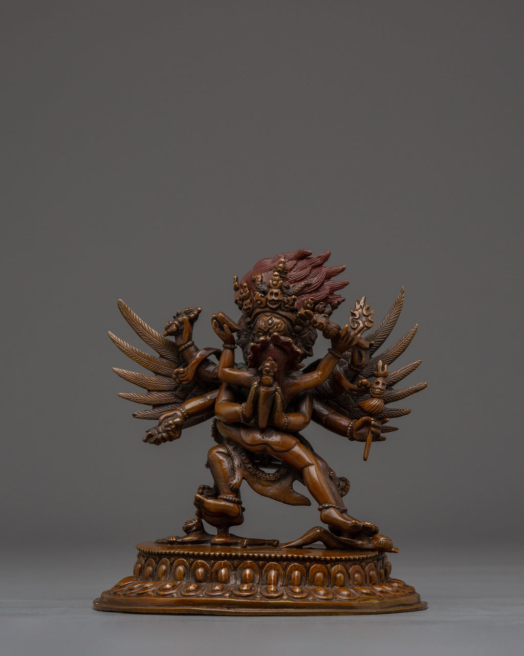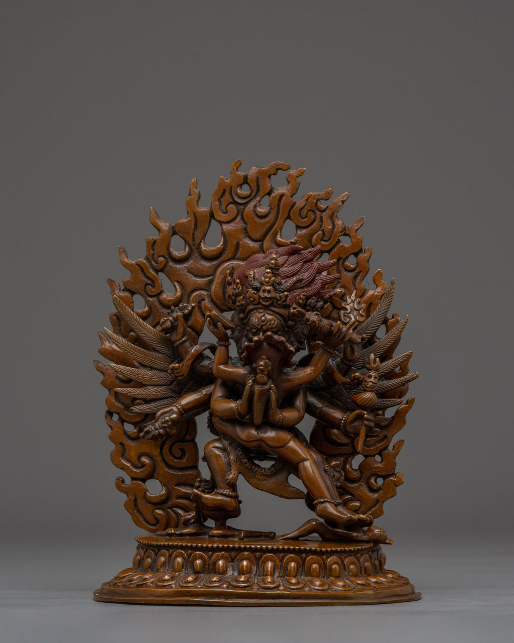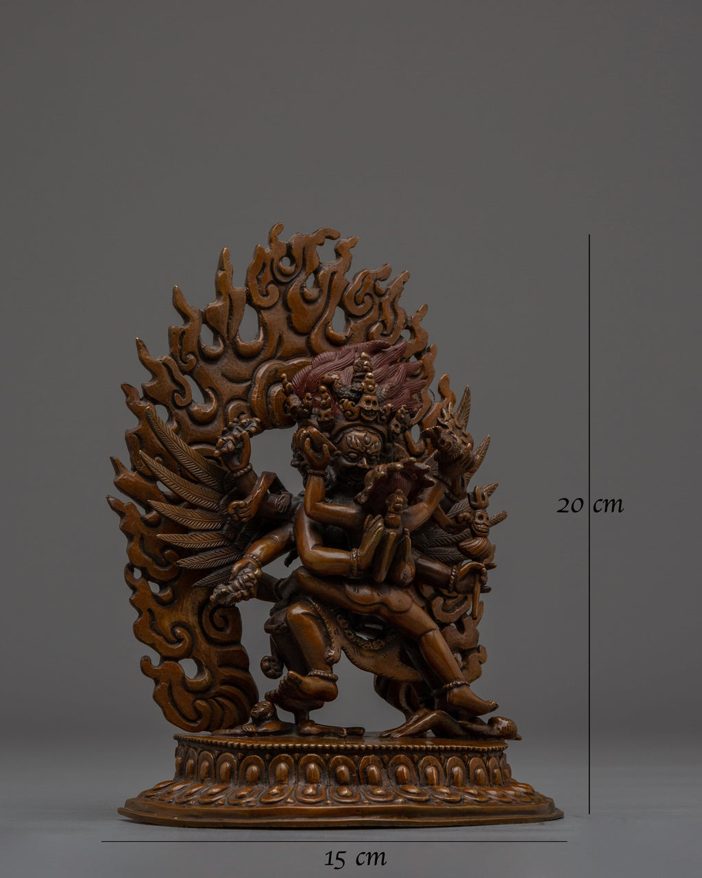 Tibetan Vajrakilaya Deity stands 7.9”/20cm in height and 5.9”/15cm at the base, with a weight of 1.69 kg. Handcrafted from an oxidized copper body, the statue embodies the fierce and wrathful form of Vajrakilaya (Vajrakumara), the embodiment of enlightened activity and the remover of obstacles. This compact yet potent statue is ideal for personal practice spaces, shrines, or as a meaningful spiritual gift dedicated to protection, transformation, and deep purification.