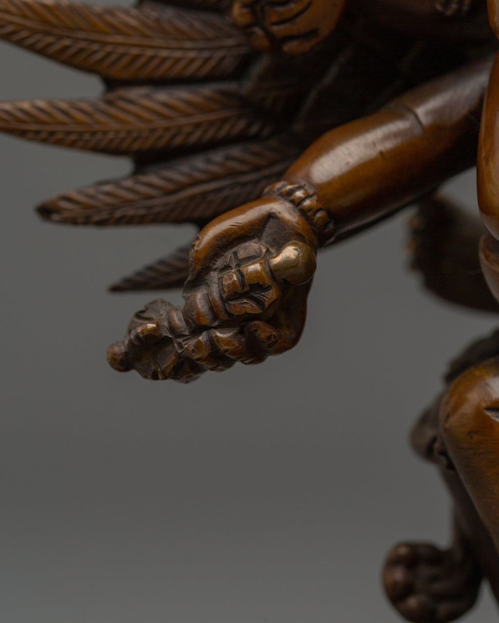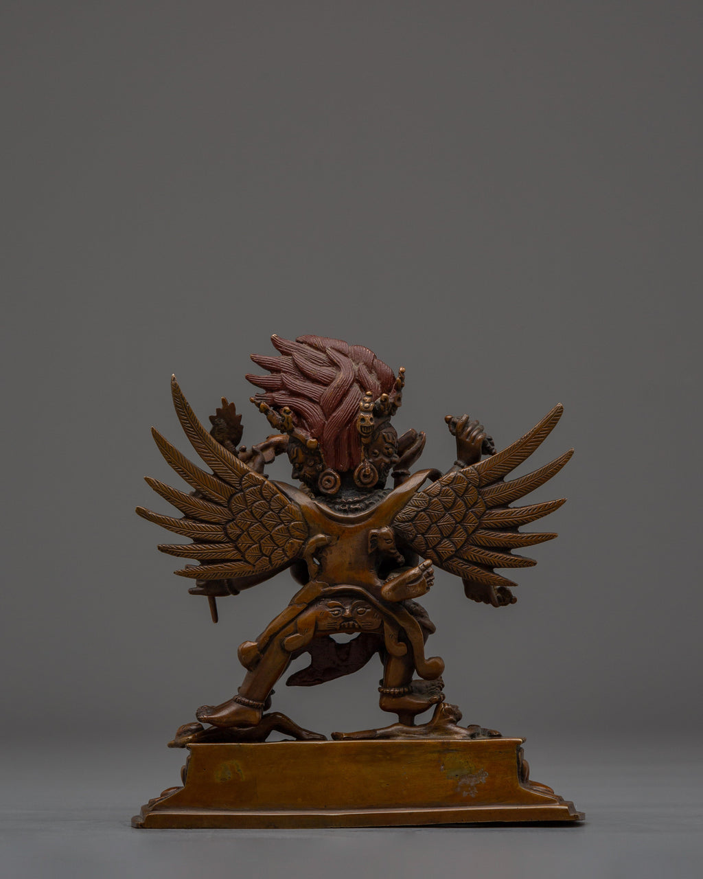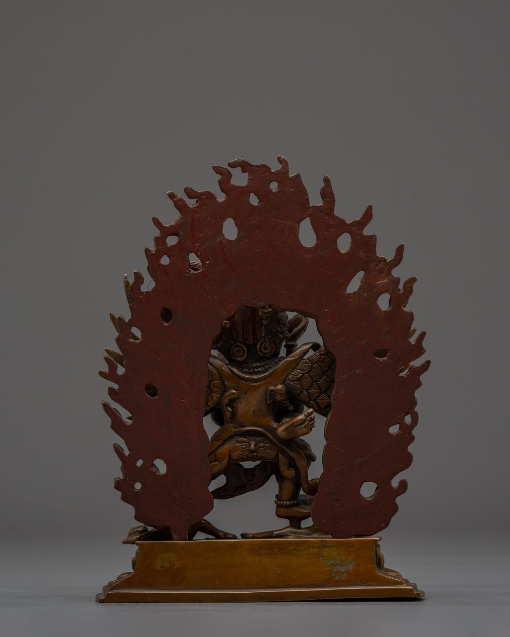 Tibetan Vajrakilaya Deity stands 7.9”/20cm in height and 5.9”/15cm at the base, with a weight of 1.69 kg. Handcrafted from an oxidized copper body, the statue embodies the fierce and wrathful form of Vajrakilaya (Vajrakumara), the embodiment of enlightened activity and the remover of obstacles. This compact yet potent statue is ideal for personal practice spaces, shrines, or as a meaningful spiritual gift dedicated to protection, transformation, and deep purification.