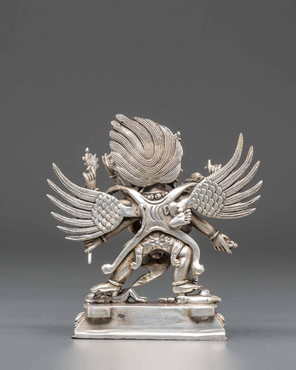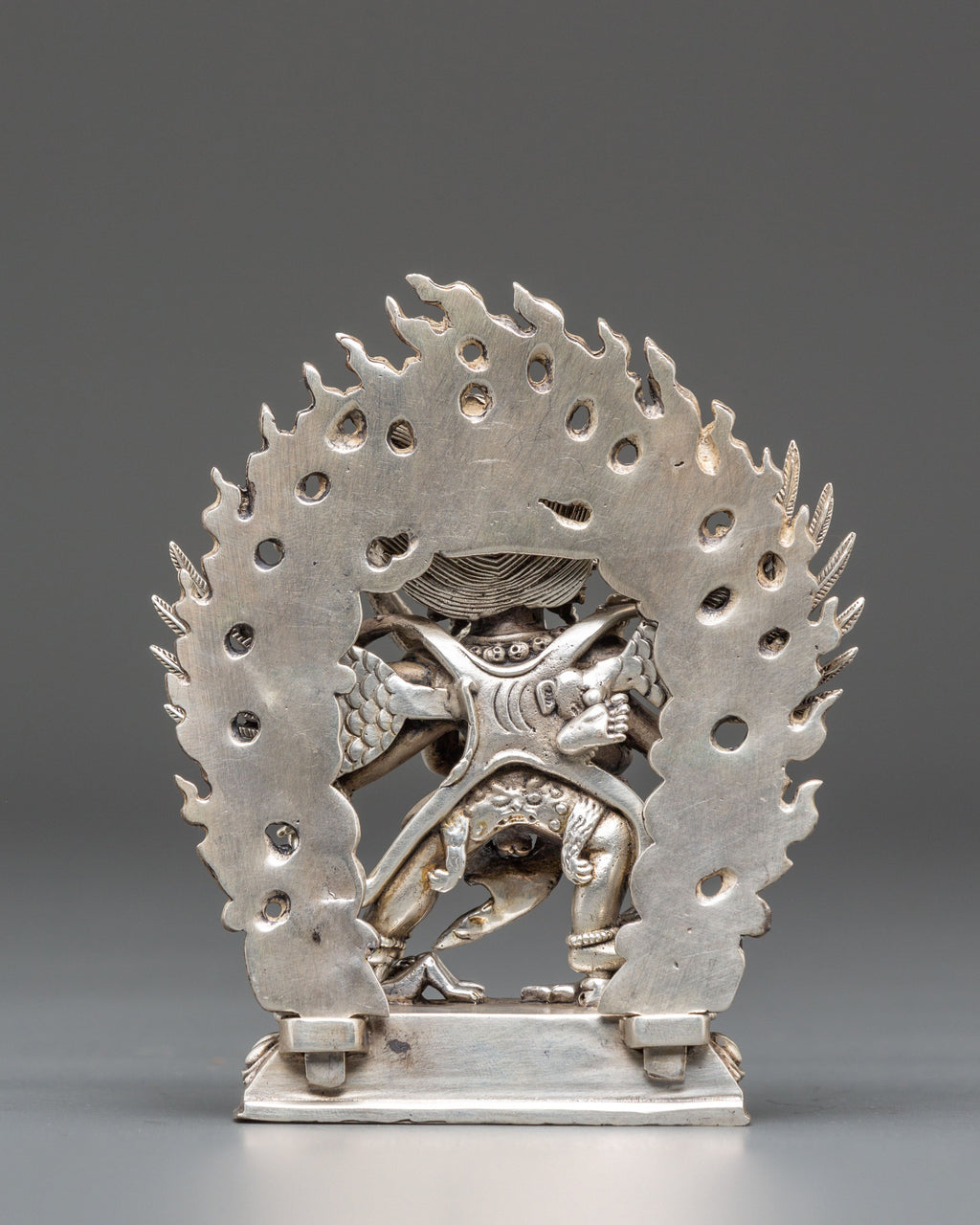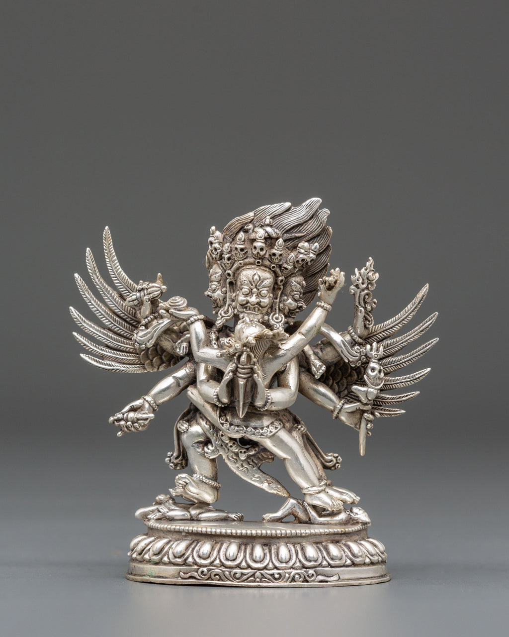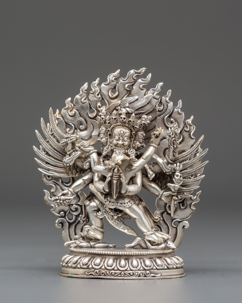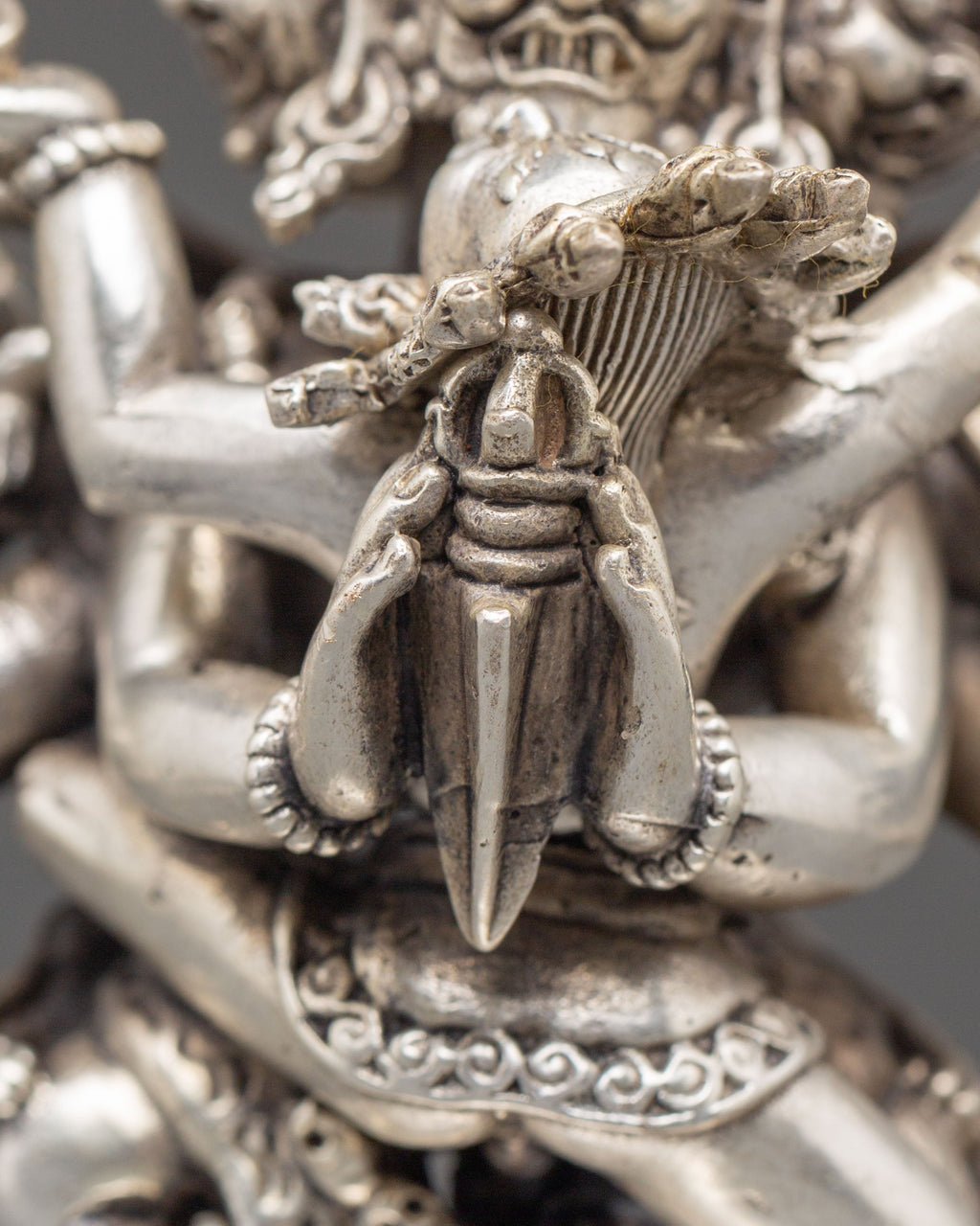 Vajrakilaya is a wrathful deity who embodies the power of purification. His fierce expression and dynamic posture symbolize the destruction of harmful energies, empowering the practitioner to overcome the five poisons: attachment, anger, ignorance, jealousy, and pride. This deity's role in removing obstacles makes the Vajrakilaya Deity Statue an influential protective figure in any spiritual practice. The silver-plated detailing enhances the intricate design, symbolizing the refined wisdom and compassionate power that underlie Vajrakilaya's wrathful appearance.