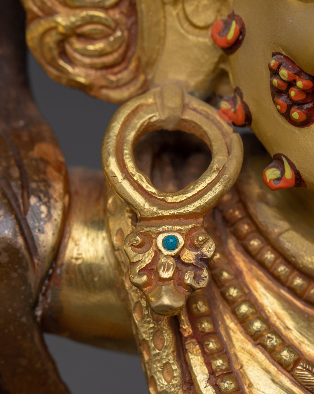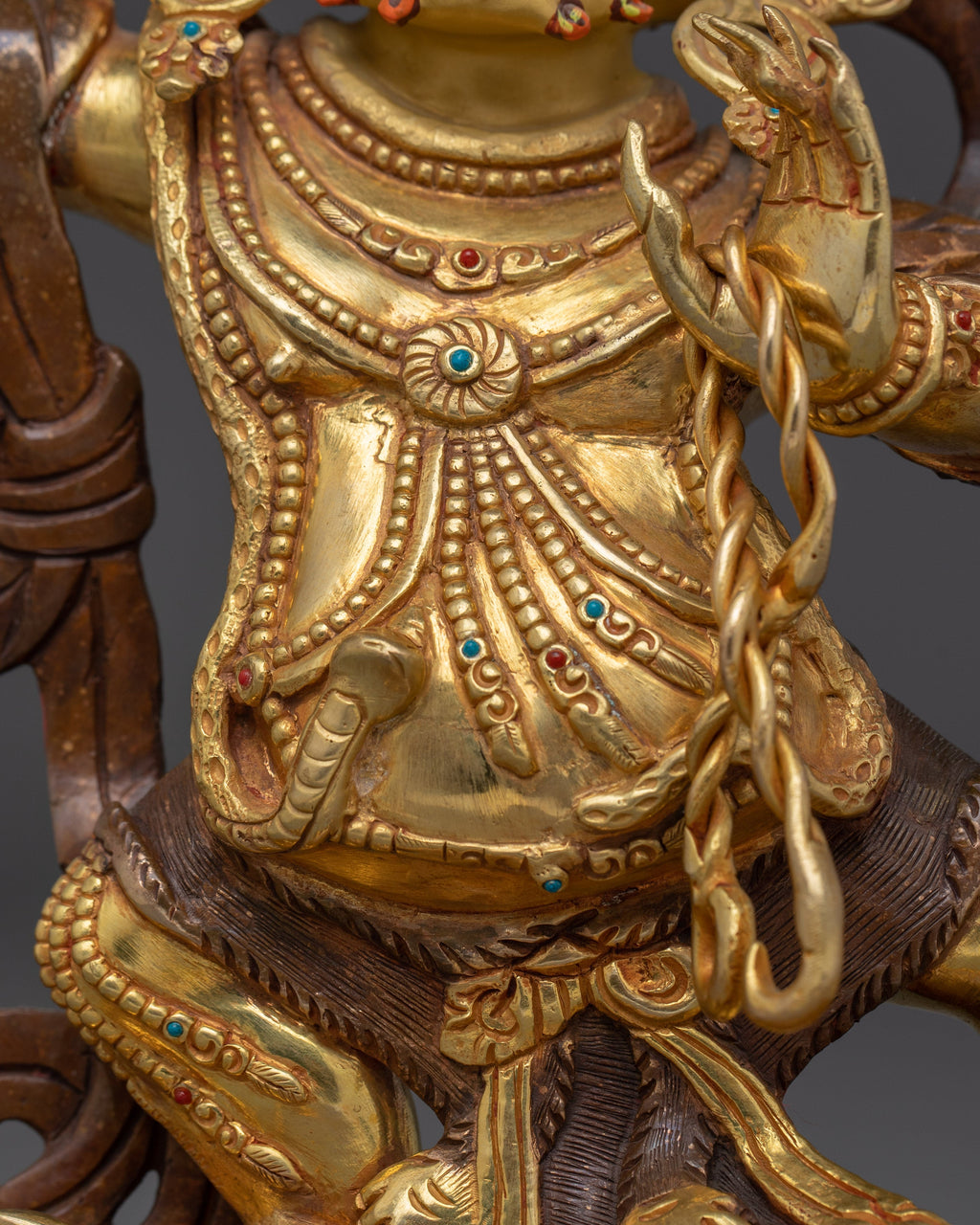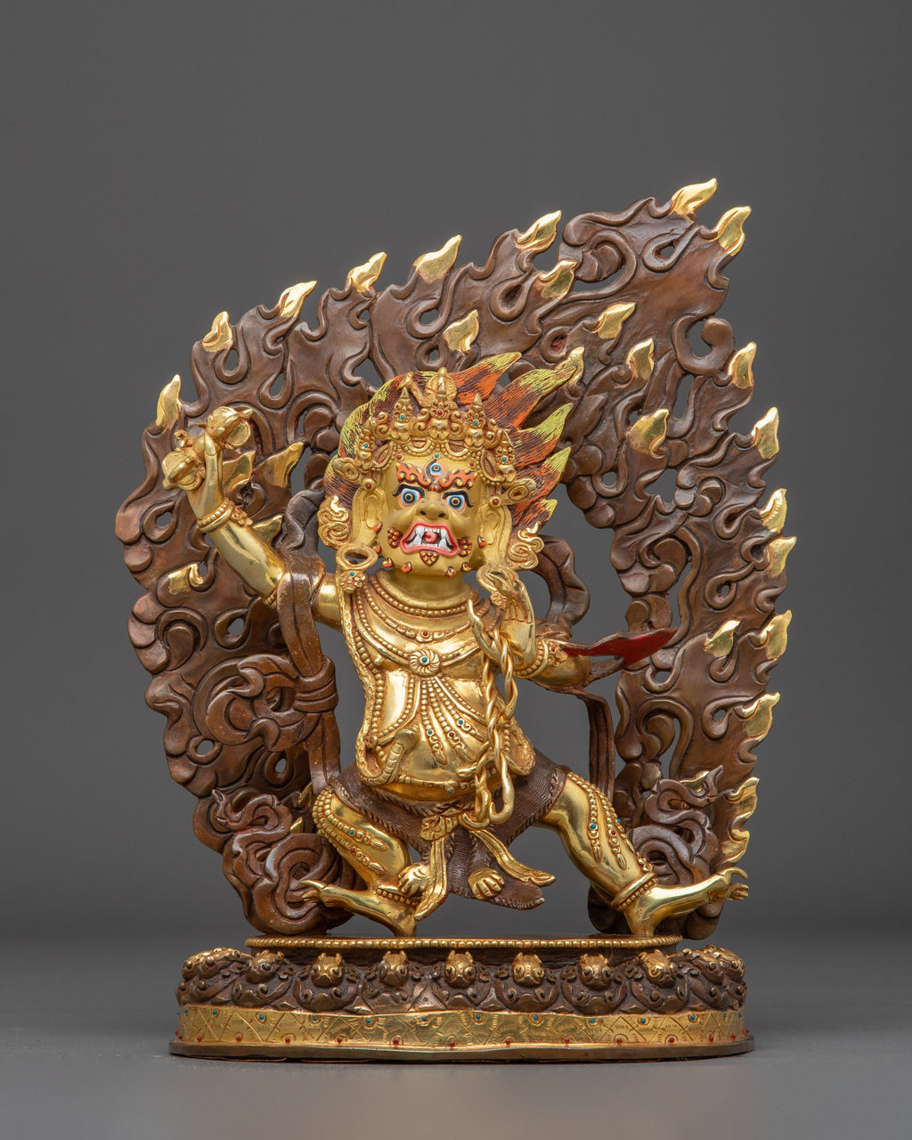 The Tibetan Vajrapani Bodhisattva Statue is handcrafted with painstaking attention to detail, highlighting the deity's ferocious expression, dynamic posture, and ritual qualities. The oxidized copper base adds depth to the statue, while gold-plated embellishments underline Vajrapani's celestial presence. Every detail, from the flowing clothes to the symbolic implements, exemplifies traditional Tibetan workmanship and spiritual symbolism, making this statue both an artistic masterpiece and a precious spiritual tool.