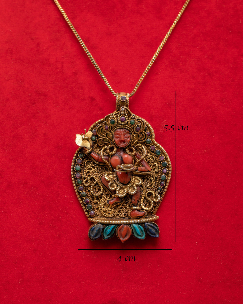 This exquisite Vajravarahi Dakini Pendant showcases masterful metalwork featuring the powerful feminine wisdom deity in her traditional dancing posture. The Buddhist feminine wisdom jewelry displays intricate silver craftsmanship with radiant gold plating, capturing Vajravarahi holding the kartika knife and skull cup. The ornate frame is adorned with vibrant artificial stones, including coral, turquoise, lapis lazuli, ruby, and panna, creating a stunning contrast against the golden metalwork and demonstrating the finest Tibetan jewelry artistry.