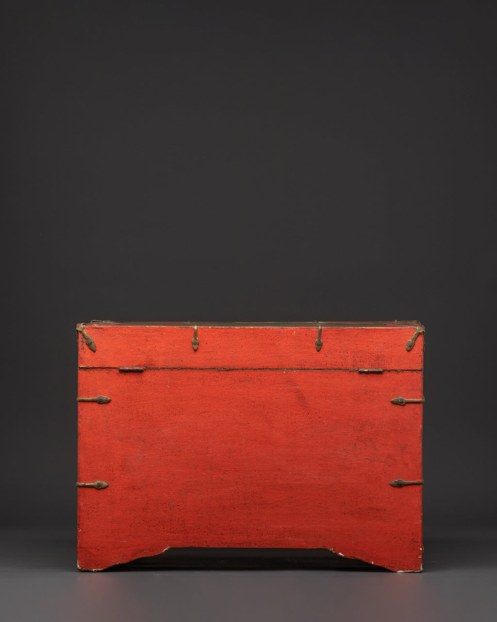Constructed from wood and coated with acrylic paints, the box is intended for the storage of ritual implements, prayer beads, offerings, or personal mementos. It includes an opening lid with a metal clasp, ensuring the security of your items while providing a classic appearance. Measuring 38.5 cm in width and weighing 2.38 kg, it offers ample space without appearing cumbersome, suitable for both functionality and presentation.