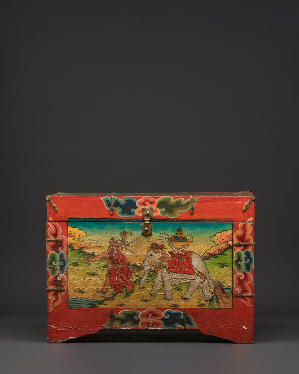 Enhance your environment with the sacred beauty and striking Tibetan craftsmanship of this traditional Tibetan wooden ritual box. The hand-painted depiction features a deity guiding a beautifully adorned elephant, symbolizing spiritual guidance, strength, and protection. This box, decorated with vibrant clouds and traditional designs, serves as both a practical object and a striking visual element for any altar or sacred space.
