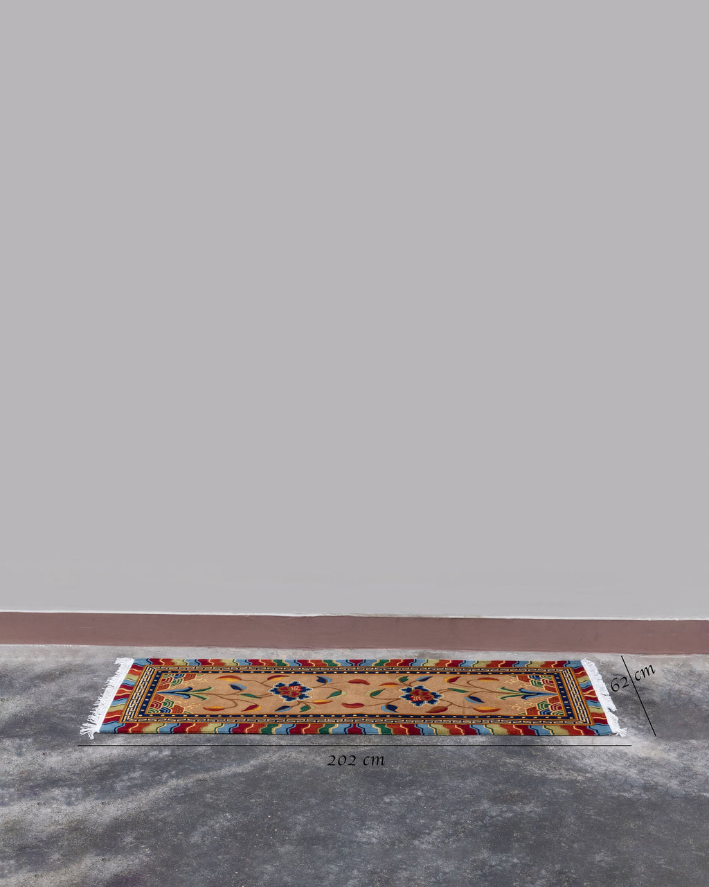 The carpet measures 62cm x 202cm with a thickness of 9mm, making it suitable for both meditation rooms and elegant home décor. The 120-knot technique ensures a fine, dense structure, highlighting intricate details that carry the warmth and authenticity of Himalayan weaving traditions. Tibetan wool is revered for its resilience, while New Zealand wool adds a silky softness, creating the perfect balance of strength and comfort.