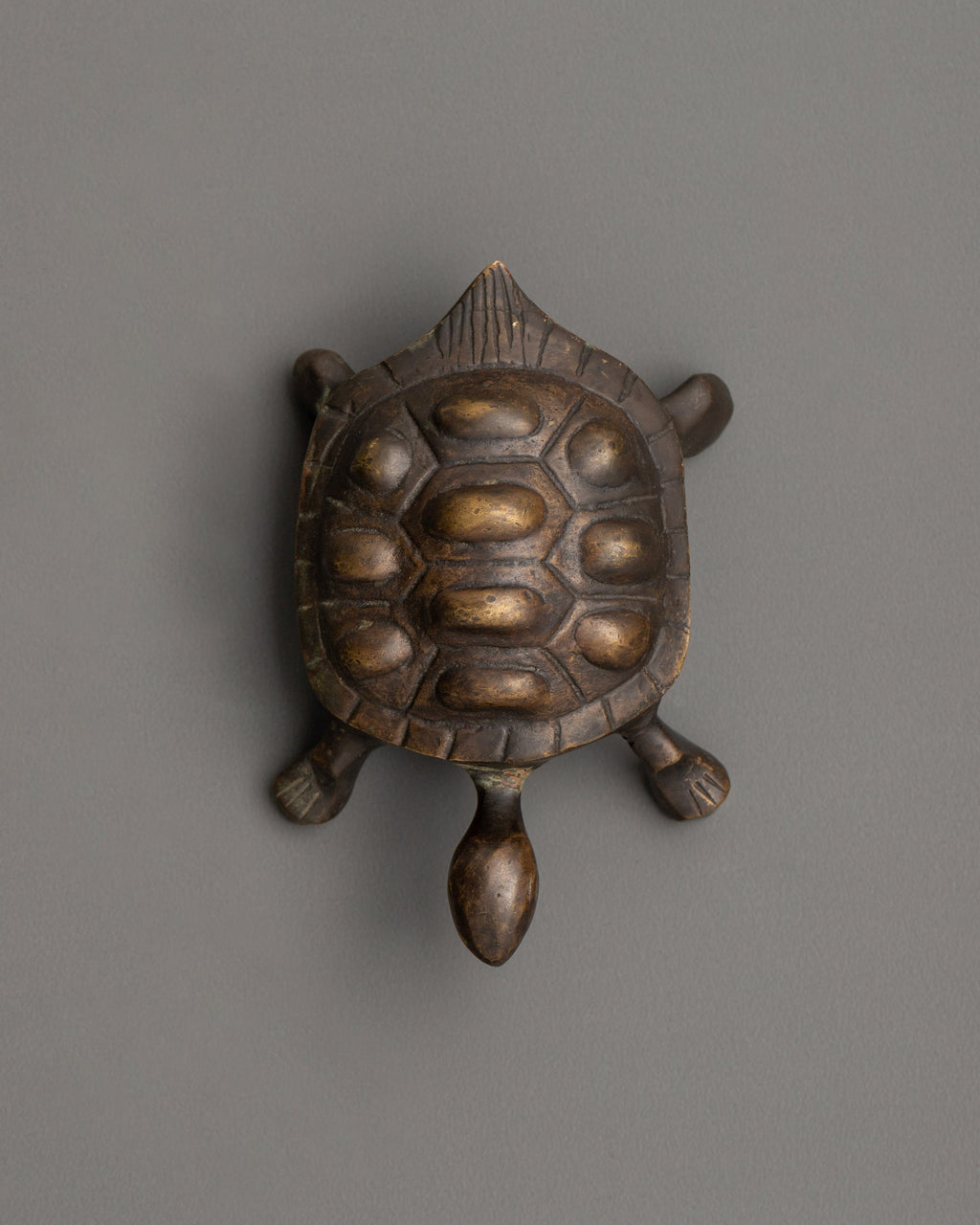 This handmade Brass Tortoise Figurine brings peace and positive energy into your house. This turtle sculpture is 4cm tall, 7cm wide, and 11cm across from the side. It is made of brass and has a timeless antique finish. It weighs 0.36kg and is the ideal size to display on your altar, desk, or shelf as a sign of longevity, stability, and protection.