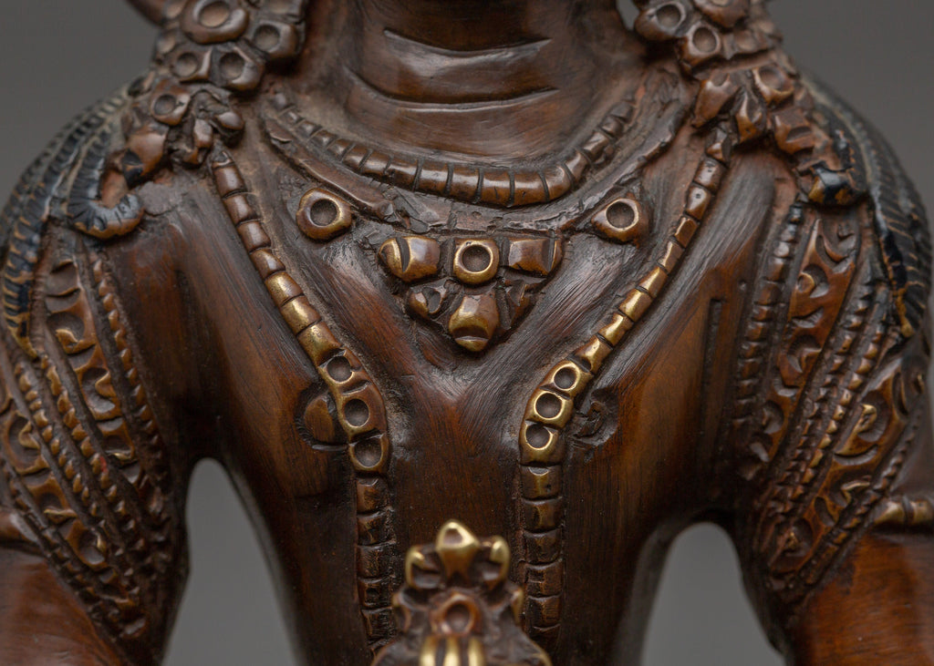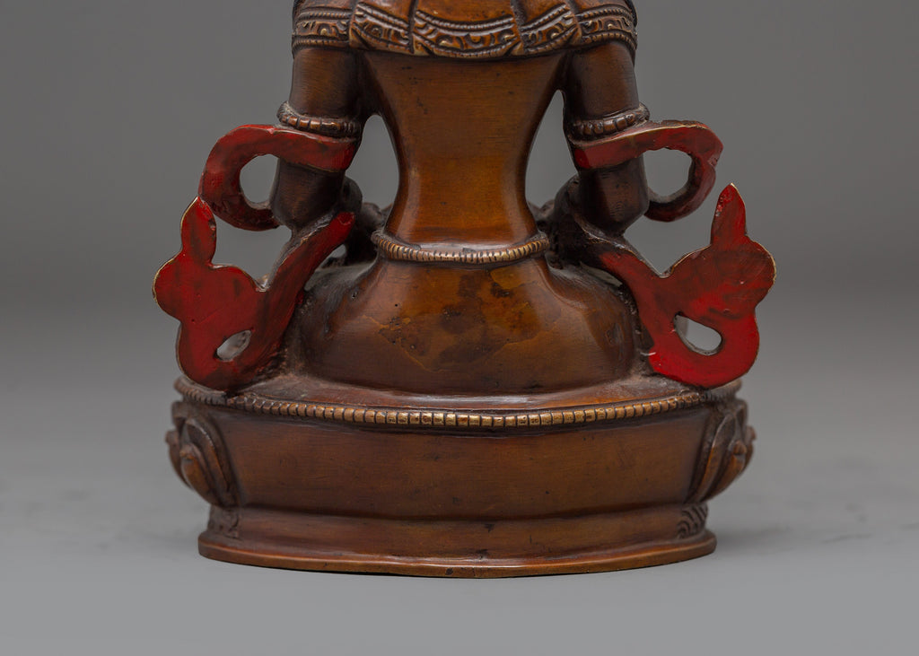 The sculpture incorporates detailed crown embellishments, layered ornaments, and elaborate robe patterns that reflect the creativity and symbolic depth of Buddhist motifs. Amitayus' gentle look and symbolic gestures promote mindfulness, peace, and a deeper connection to the essence of life. Each design element conveys a tale about spiritual ambition, providing not only beauty but also a reminder of the path to inner peace, compassion, and enlightened living.
