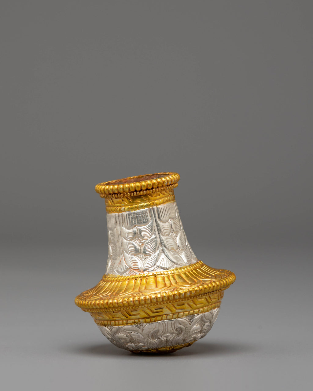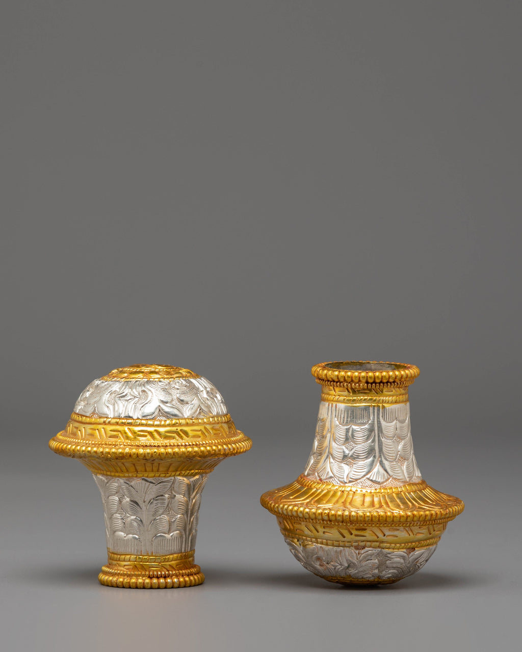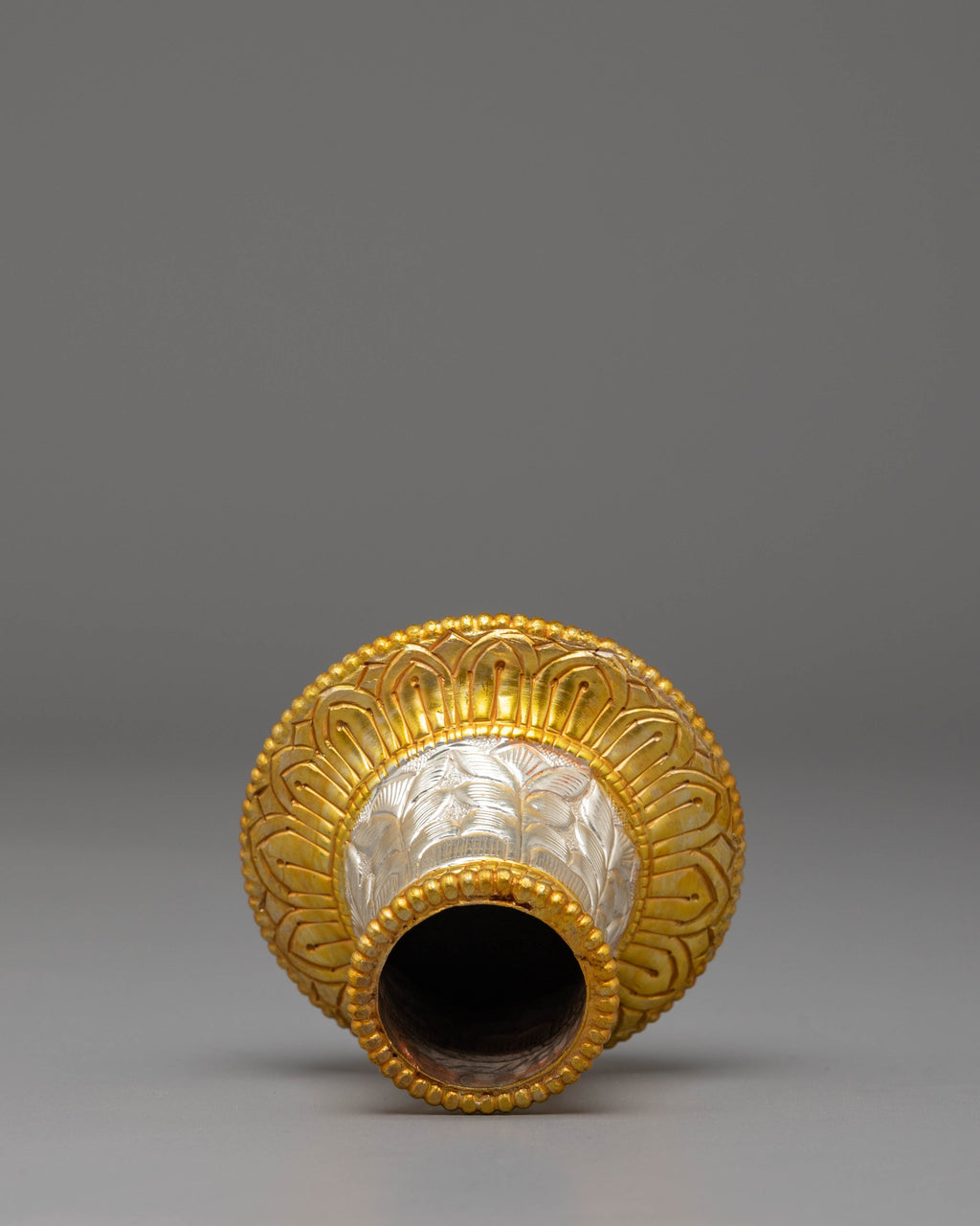 Elegant motifs ripple across the cover, incorporating traditional patterns that symbolize prosperity, purity, and sacred protection. The combination of silver-plated texture with gold-accented edges enhances its visual presence, allowing it to stand out on altars, shrines, or ritual displays. The rich sheen created by mixed plating highlights the craftsmanship and cultural artistry that went into its creation.