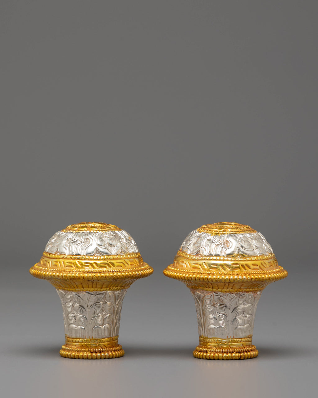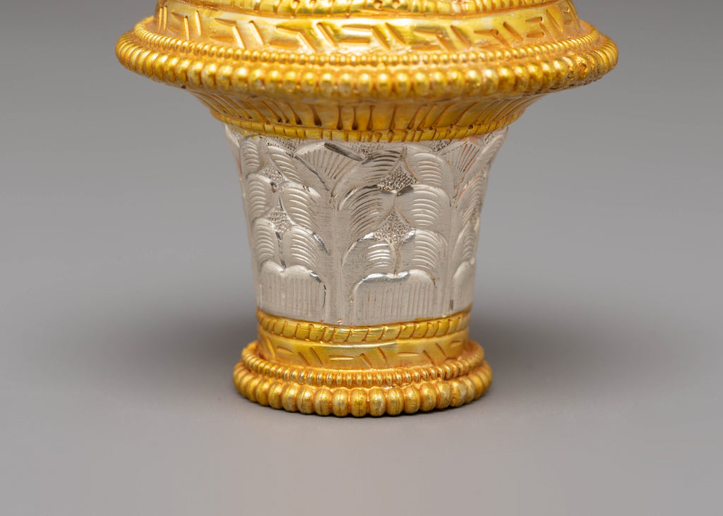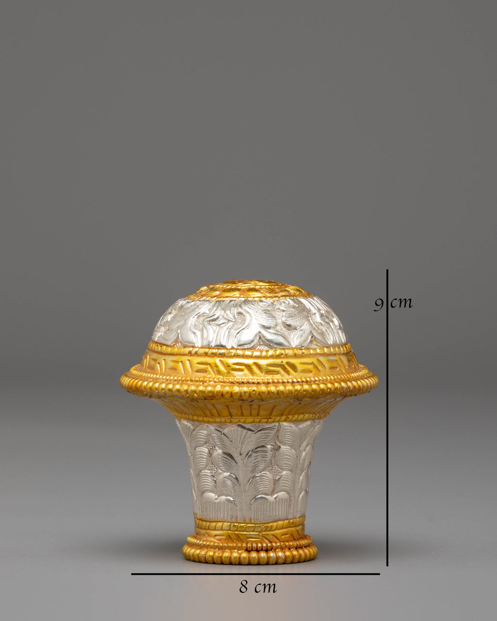 This Traditional Brocade Stick Cover is expertly crafted with a copper body and detailed silver and gold plating, creating a beautifully refined ritual accessory rooted in Tibetan tradition. The domed top features ornate floral-style carvings that flow across the surface, reflecting harmony, auspiciousness, and spiritual refinement. Its shape is inspired by classical Buddhist ritual tools, making it a meaningful addition to ceremonial collections.