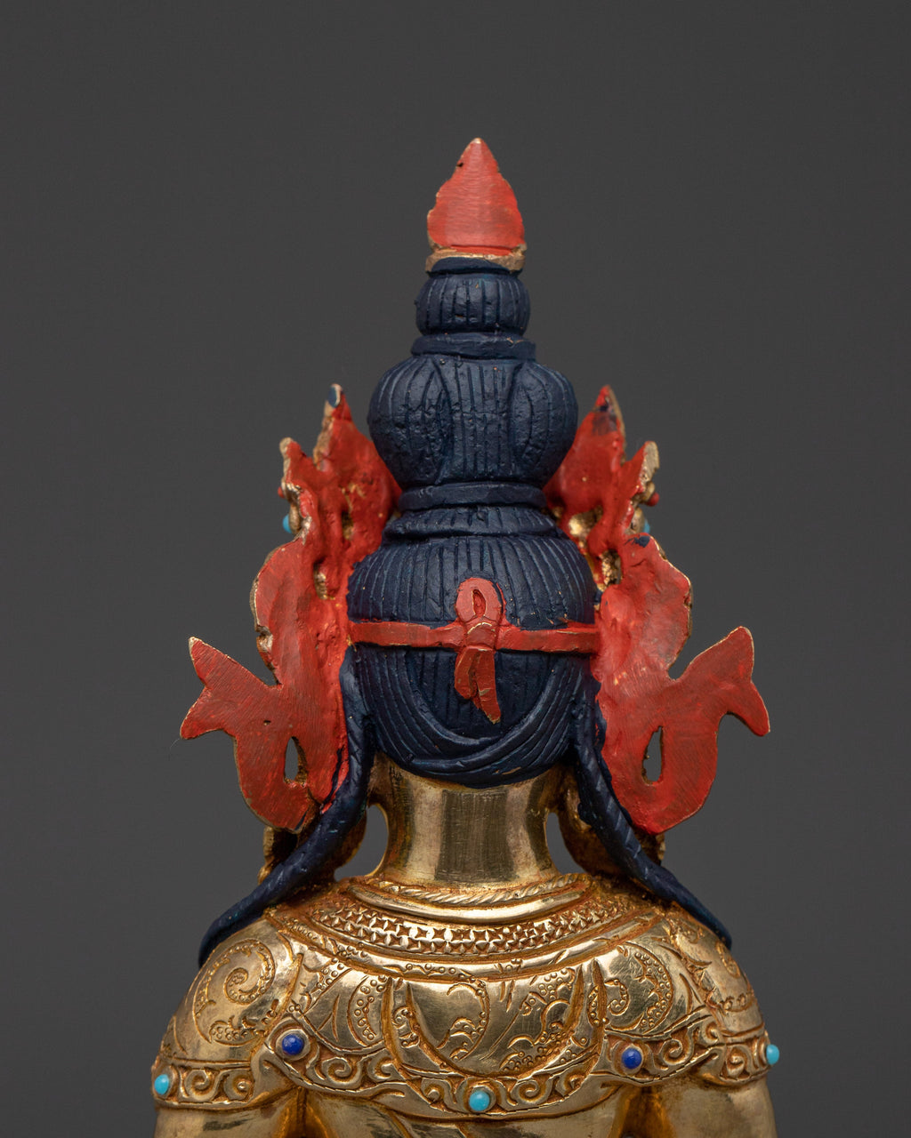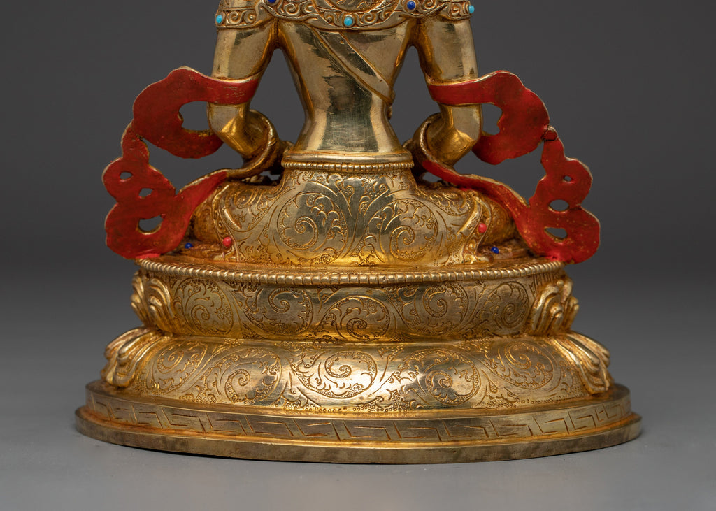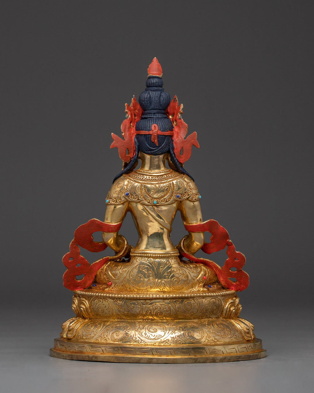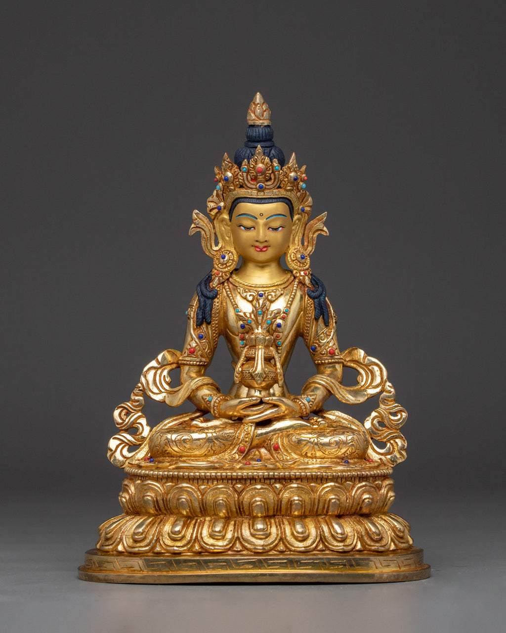The traditional Buddhist Amitayus deity figurine measures 10.2 inches (26 cm) in height with a base of 7.3 inches (18.5 cm) and weighs 2.12 kg. Crafted from a sturdy copper body, it is lavishly gilded in 24K gold and decorated with intricate gold and acrylic paintings. The addition of carefully placed gemstones enhances the statue’s spiritual significance and aesthetic beauty. This finely crafted statue is an ideal centerpiece for meditation altars, sacred spaces, or as a thoughtful spiritual gift to inspire blessings of long life and well-being.