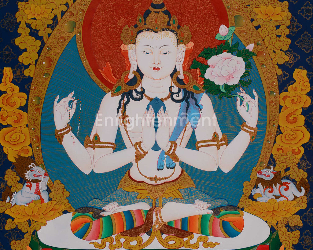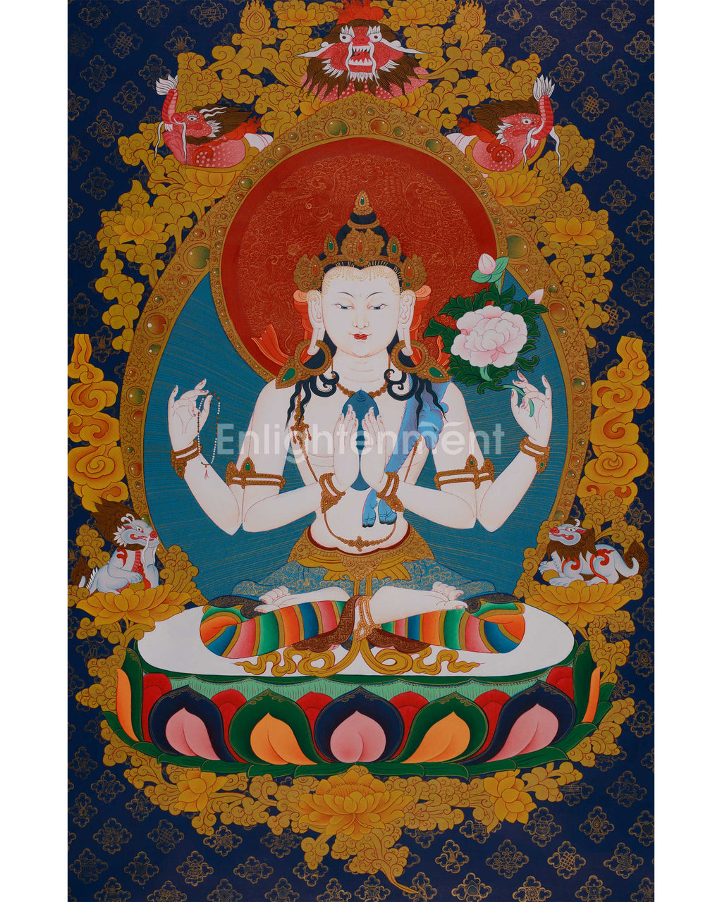 Traditional Buddhist Chenrezig Thangka with 24K Gold Detailing and Symbolic Elements for Meditation