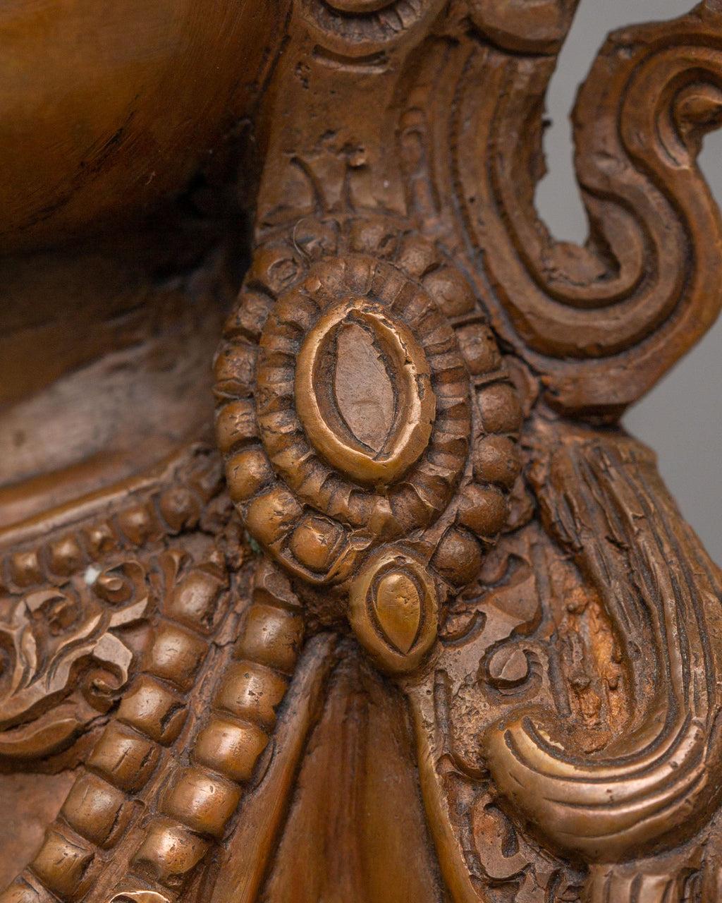 This Vajrasattva statue features traditional Himalayan artistry with refined detailing across the crown, facial expression, and flowing monastic robes. He is depicted seated in a meditative posture, holding the vajra and bell, symbolizing the union of wisdom and compassion. The oxidized copper finish enhances the depth of each carved element, highlighting sacred motifs while preserving the authenticity of traditional Buddhist sculpture.