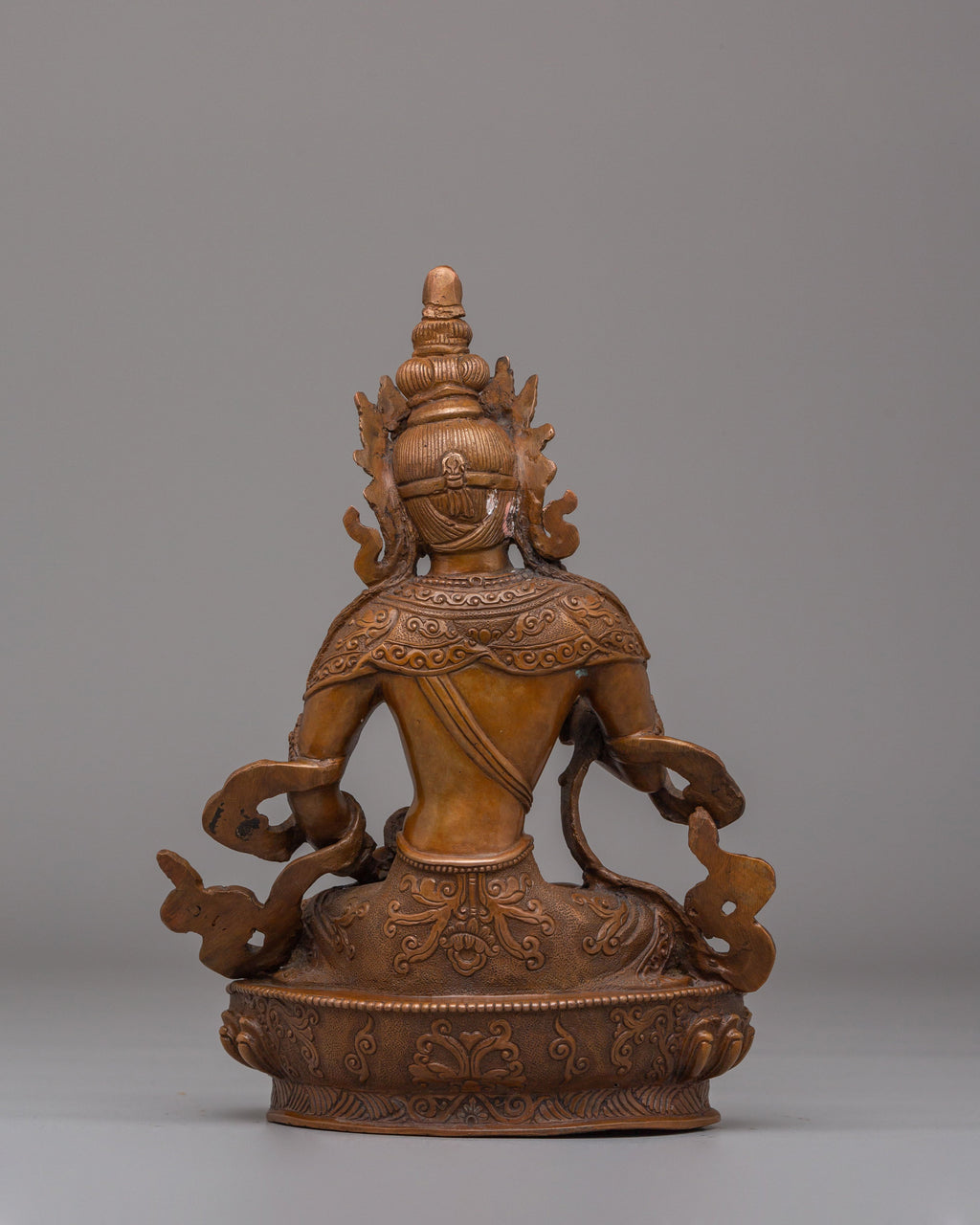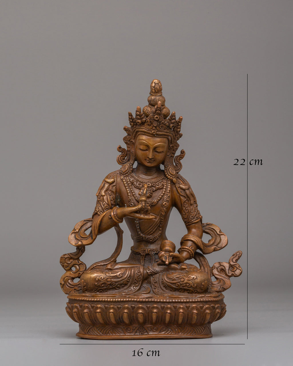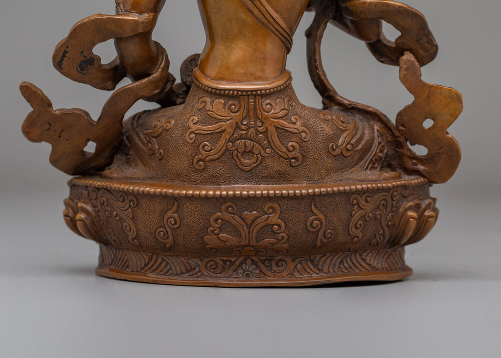 The Handcrafted Traditional Buddhist Vajrasattva Statue for Altar is a sacred representation of Vajrasattva, the revered deity of purification in Tibetan Buddhism. Crafted from an oxidized copper body, this statue measures 22 cm in height and 16 cm in width, weighing 1.35 kg, making it well-suited for home altars, meditation spaces, and spiritual shrines. Vajrasattva is widely invoked to cleanse negative karma and restore clarity, making this statue a meaningful addition to any Buddhist practice.
