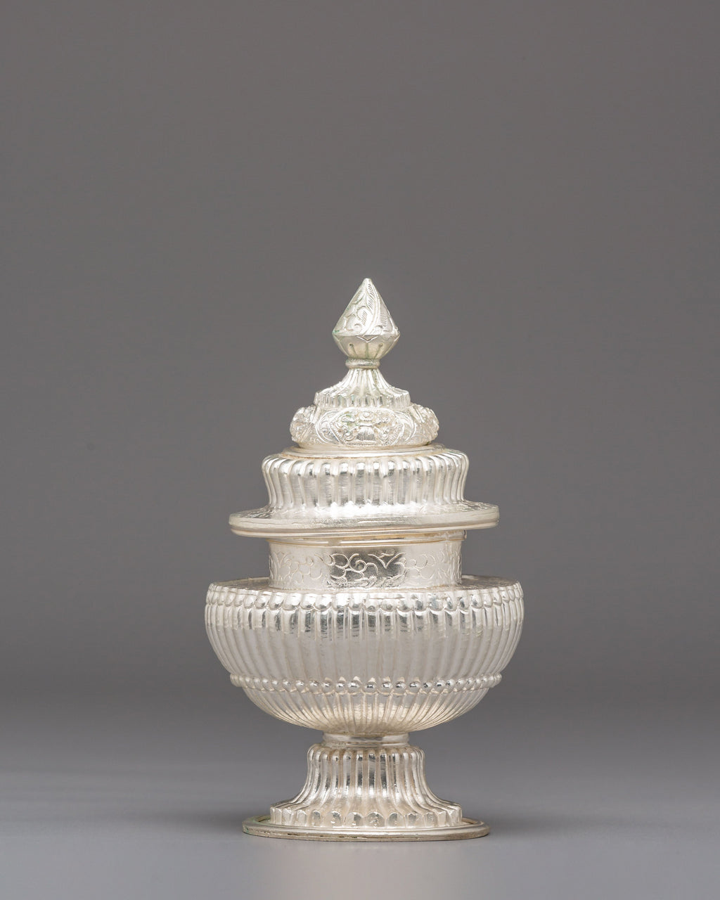 Used in Buddhist and Hindu ceremonies, this ritual rice pot symbolizes abundance, gratitude, and the act of offering devotion to the divine. Traditionally, it is filled with rice, grains, or water—representing prosperity and the continuity of life. The silver plating enhances its sacred significance, reflecting inner peace and spiritual clarity. Every detail of this copper vessel embodies cultural heritage, transforming ordinary rituals into moments of reflection and connection with higher consciousness.
