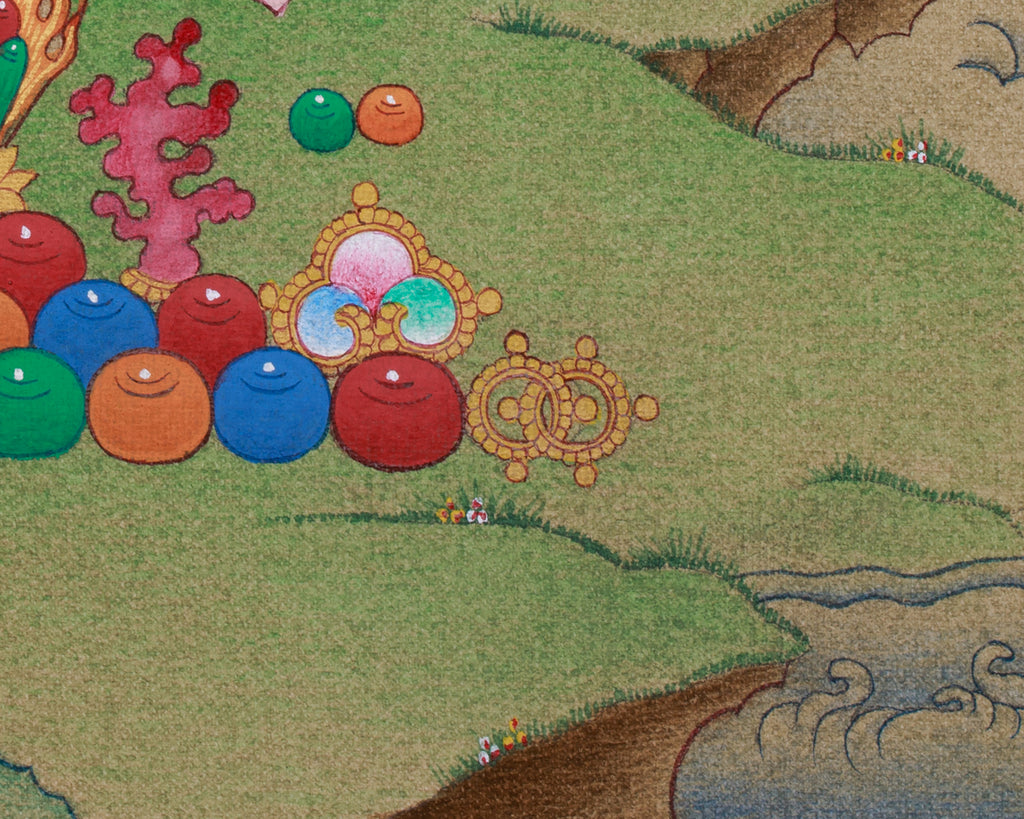 Dzambhala is shown in this thangka with all the regal emblems of riches and fortune. He wears a utpala garland, which represents enlightenment and purity, and is crowned with five jewels. His left hand holds a mongoose spouting gems, further signifying his role in bestowing riches, while his right hand holds a citron fruit, a symbol of wealth and abundance. He is sitting calmly on a vivid lotus, and the moon disc on a lotus seat underneath him lends a sense of purity. This thangka serves as a valuable spiritual tool for those looking to attract wealth and blessings into their lives.