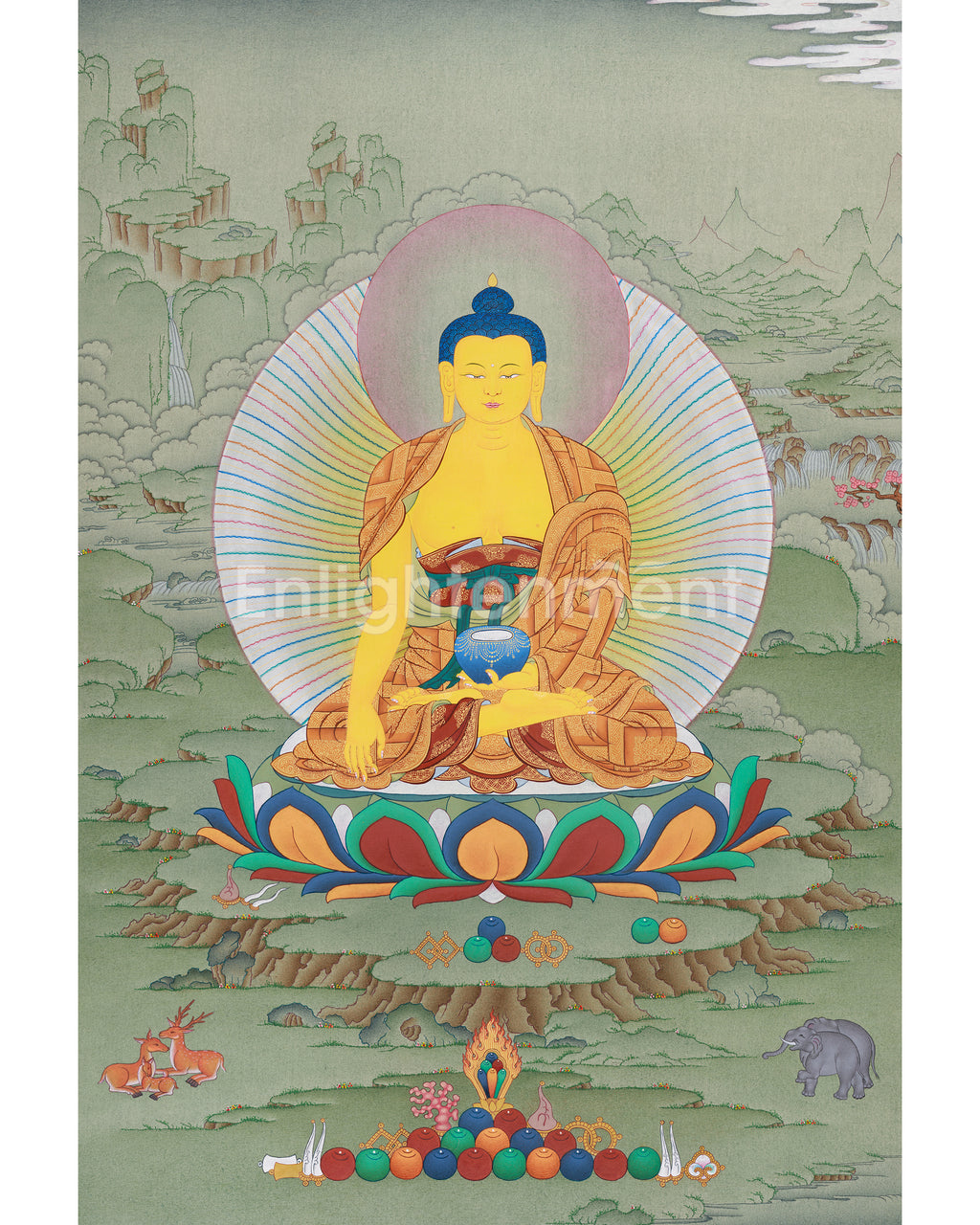 In this thangka, he is portrayed seated in serene meditation upon a blooming lotus throne, a symbol of purity and enlightenment. His right hand touches the earth in the Bhumisparsha Mudra—the “earth-witness gesture”—signifying the moment of his enlightenment. His left hand rests in his lap, holding a begging bowl that represents simplicity and the renunciation of material desires. The delicate use of 24K gold accentuates the folds of his robe and the gentle aura surrounding his enlightened form. The backdrop, softly painted with mountain landscapes and lotus motifs, adds a sense of stillness and sacred space, evoking tranquility and devotion.