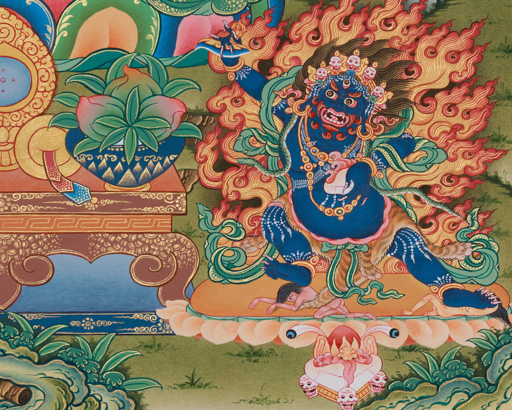 Guhyasamaja, a key deity in Vajrayana Buddhism, symbolizes the integration of wisdom and method, representing the tantric path to enlightenment. The Guhyasamaja Tantra is a highly revered text in Tibetan Buddhism, and its practice is deemed crucial for attaining Buddhahood. Often depicted with a consort, his image reflects the unity of wisdom and compassion. This thangka depicts Guhyasamaja surrounded by wrathful Mahakala and Sakya Mahakala, symbolizing fierce compassion and protection. The background includes clouds, fiery mandalas, and sacred geometry, representing the cosmic dance of wisdom and elements vital for awakening. He has three serene faces (blue, white, and red) and twelve arms holding sacred implements such as a vajra, bell, lotus, sword, jewel, and dharma wheel, symbolizing mastery over the mind and existence. His consort embraces him in the vajra posture, symbolizing the inseparable unity of wisdom and method—the essence of tantric realization. The deity sits upon a lotus and a moon disc.