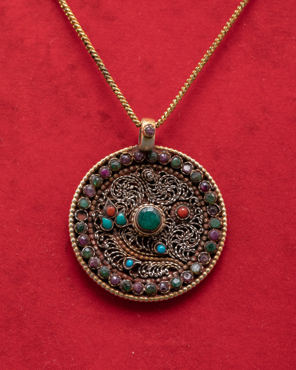 Beyond its visual appeal, the pendant holds deep symbolic meaning. The coral is associated with vitality, turquoise with protection, and ruby with passion and strength. These stones are not just beautiful; they are believed to enhance one's energy and presence. This unique handmade pendant offers a blend of cultural significance and artistic beauty, making it a meaningful gift or a cherished addition to your jewelry collection. Ideal for anyone who appreciates the elegance of ethnic jewelry, this piece brings together artistry and the power of gemstones in a way that is truly exceptional.