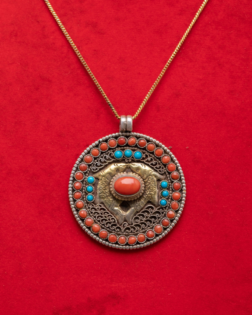 In the middle of this ethnic Tibetan pendant is a big coral stone set in gold. It is encircled by two twin patterns that look like snow lions, which are historic Tibetan emblems of fearlessness and sacred protection. There are rows of deep red coral and bright turquoise stones around this focal point. The colors are similar to those found in Himalayan monasteries, festival robes, and nature. The exquisite silverwork provides depth and texture, accentuating the pendant’s individuality and cultural soul.
