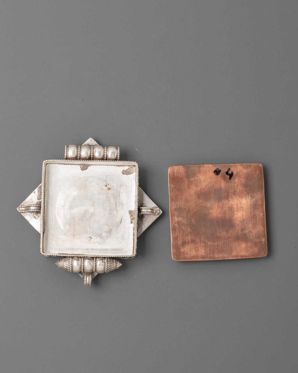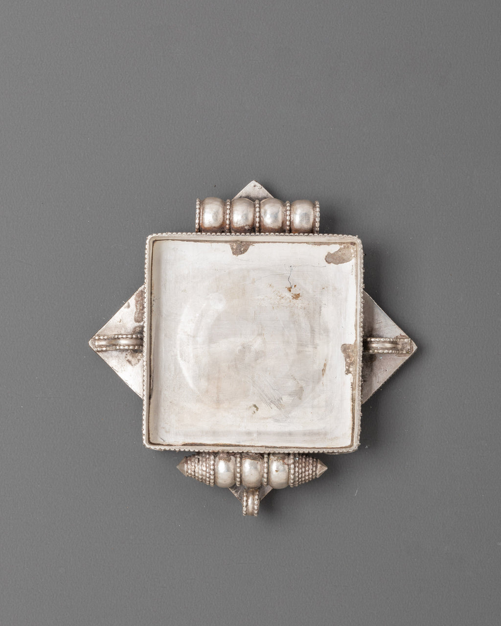 The Mandala Ghau Box Locket is a stunning piece of craftsmanship that beautifully combines spirituality with artistic design. Made from high-quality silver and featuring semi-precious stones like turquoise and coral, this locket is more than just a piece of jewelry—it is a sacred object deeply rooted in Tibetan and Buddhist culture. The design of this locket centers around the mandala, a spiritual symbol representing the universe, harmony, and the interconnectedness of all beings. The turquoise and coral gemstones add both vibrance and meaning, symbolizing protection, healing, and vitality. This Ghau box locket can be worn as an amulet for spiritual protection or used to carry sacred items close to the heart.