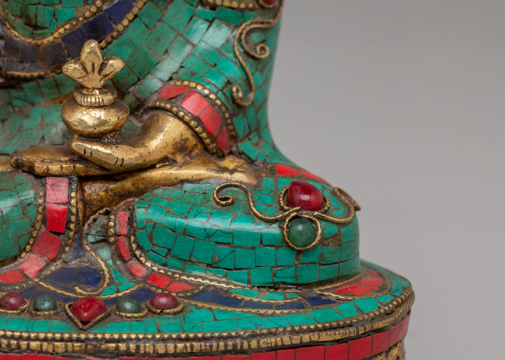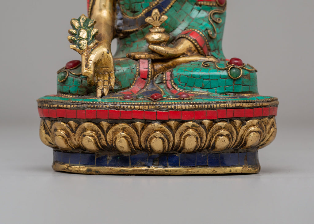 This Traditional Medicine Buddha Deity Statue is a vibrant and powerful representation of Bhaisajyaguru, the Medicine Buddha, revered in Tibetan Buddhism for his ability to heal physical and spiritual ailments. Standing at 20.5 cm tall and 14 cm wide, with a weight of 1.95 kg, this exquisite statue is made from a combination of brass and acrylic color, with intricate inlays of coral red stone, lapis lazuli, and turquoise gemstones. The use of these precious materials enhances the beauty and sacredness of the statue, making it an ideal piece for altars, meditation spaces, and homes seeking healing energy.