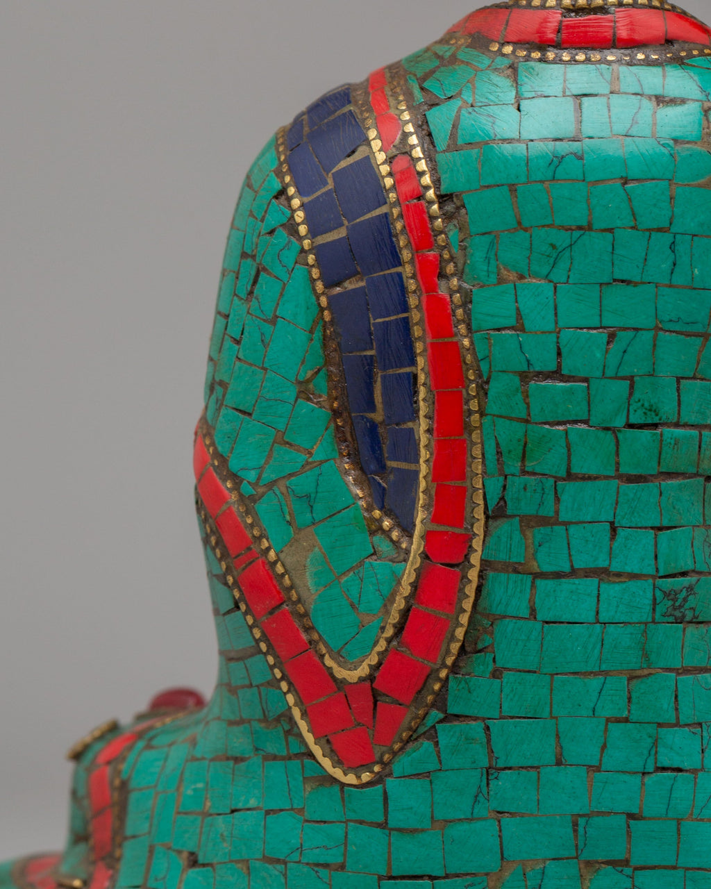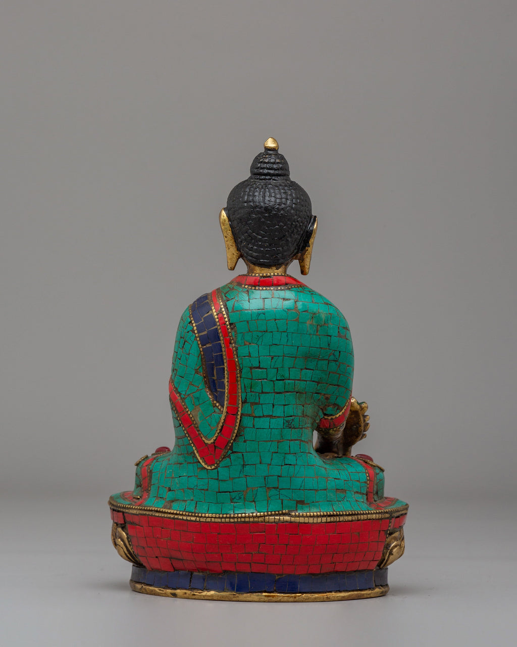 The statue depicts the Medicine Buddha seated in a serene meditative posture, holding a healing herb or bowl in his left hand, which symbolizes his ability to heal the mind, body, and soul. His right hand is raised in a gesture of protection and blessing. The colorful robe, adorned with turquoise, coral, and lapis lazuli accents, represents the Buddha’s transformative powers and the connection between the physical world and spiritual enlightenment. The detailed craftsmanship and rich color scheme of the statue make it not only a spiritual symbol but also a work of art, blending Tibetan artistic traditions with powerful healing symbolism.