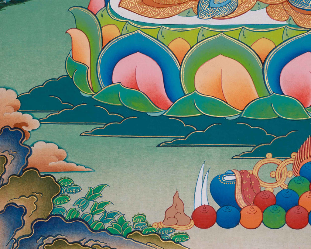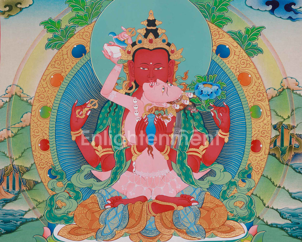Avalokiteshvara, also known as Red Chenrezig, is a manifestation of the Bodhisattva of Compassion, who is regarded in Tibetan Buddhism as the embodiment of endless kindness and mercy. While the four-armed form signifies universal protection, the red form is linked to magnetizing energy, which is the capacity to draw in virtue, harmony, and spiritual enlightenment. Red Chenrezig is invoked by practitioners to build loving bonds, foster compassion in interpersonal interactions, and nurture an open, compassionate heart. Om Mani Padme Hum, the six-syllable mantra of compassion that is sung all over the Himalayan globe, has a special place in his heart. Red Chenrezig is depicted on a colorful lotus, with his crimson representing compassion. Demonstrating generosity and enlightened activity, he forms symbolic mudras with a lotus in one hand, encircled by a luminous halo. He is depicted holding his consort, underscoring the inseparable bond between method and insight—the core of enlightenment. Adorned with silken scarves, a golden crown, and celestial ornaments, he is set against a serene backdrop of sky, mountains, and water, evoking tranquility. Bring home the blessing of Red Chenrezig to enhance your spiritual practice, ideal for meditation rooms, altars, or sacred spaces, and invite compassion and harmony into your life.