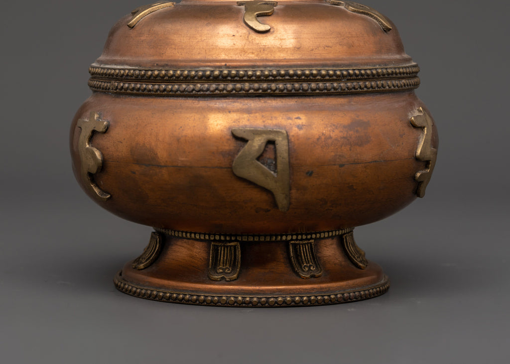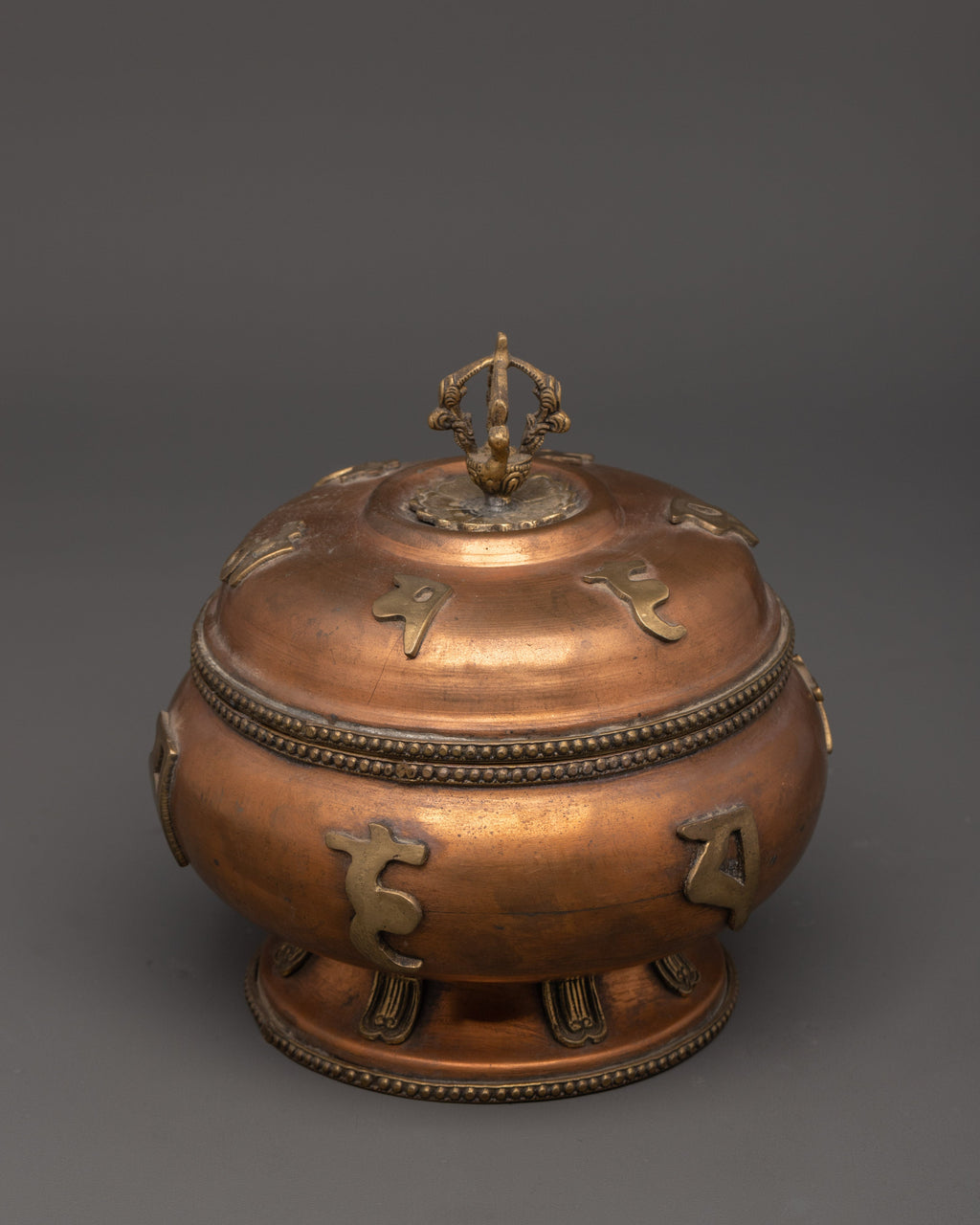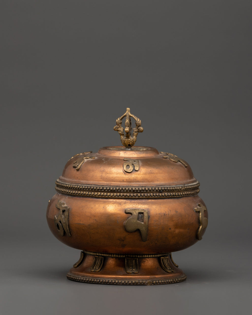 This pot is used to contain rice grains or ceremonial offering items, which serve as the focus on altars and shrines. The Om inscriptions symbolize universal vibration and divine truth, making this pot a potent spiritual artifact. Its antique polish and graceful contours reflect Tibetan creativity and attentive craftsmanship, establishing a sacred link between ritual practice and divine admiration.