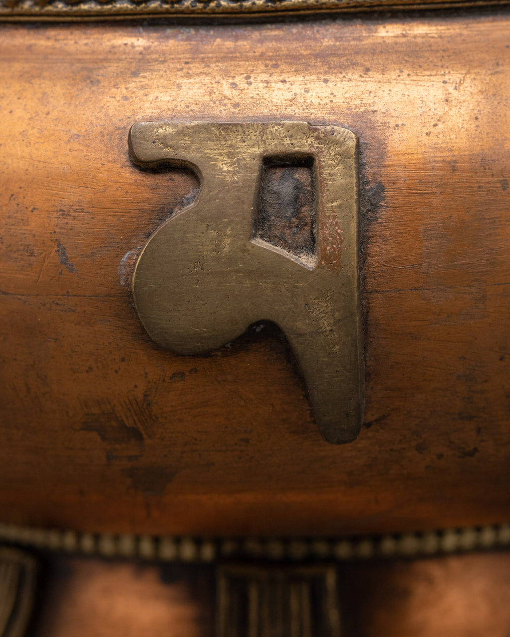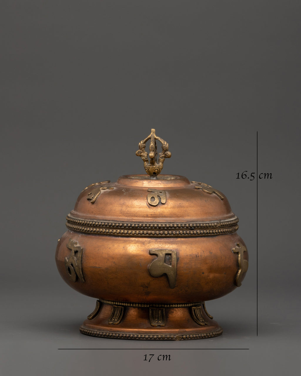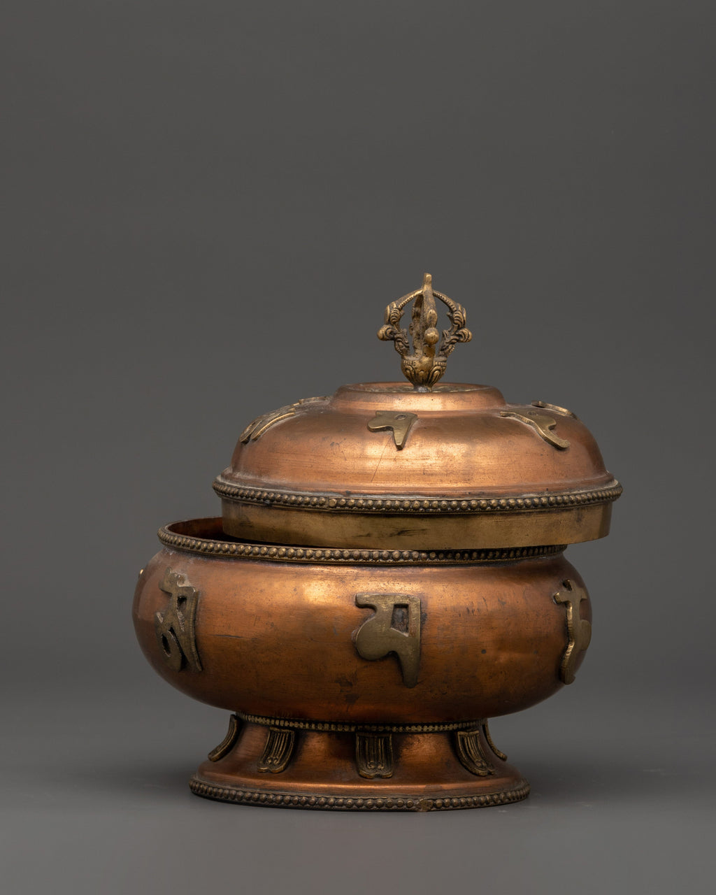 This pot is used to contain rice grains or ceremonial offering items, which serve as the focus on altars and shrines. The Om inscriptions symbolize universal vibration and divine truth, making this pot a potent spiritual artifact. Its antique polish and graceful contours reflect Tibetan creativity and attentive craftsmanship, establishing a sacred link between ritual practice and divine admiration.