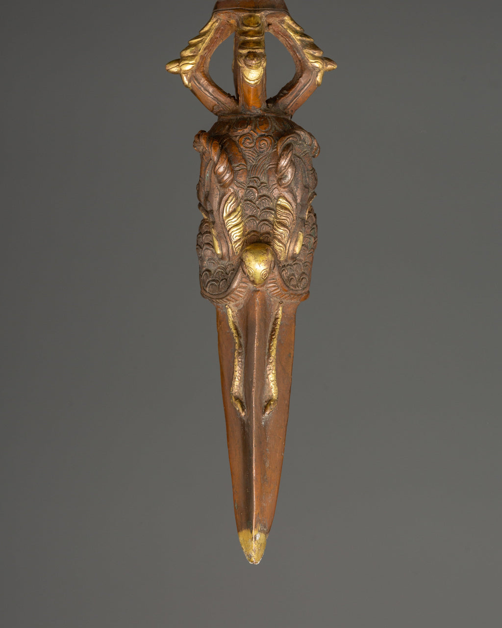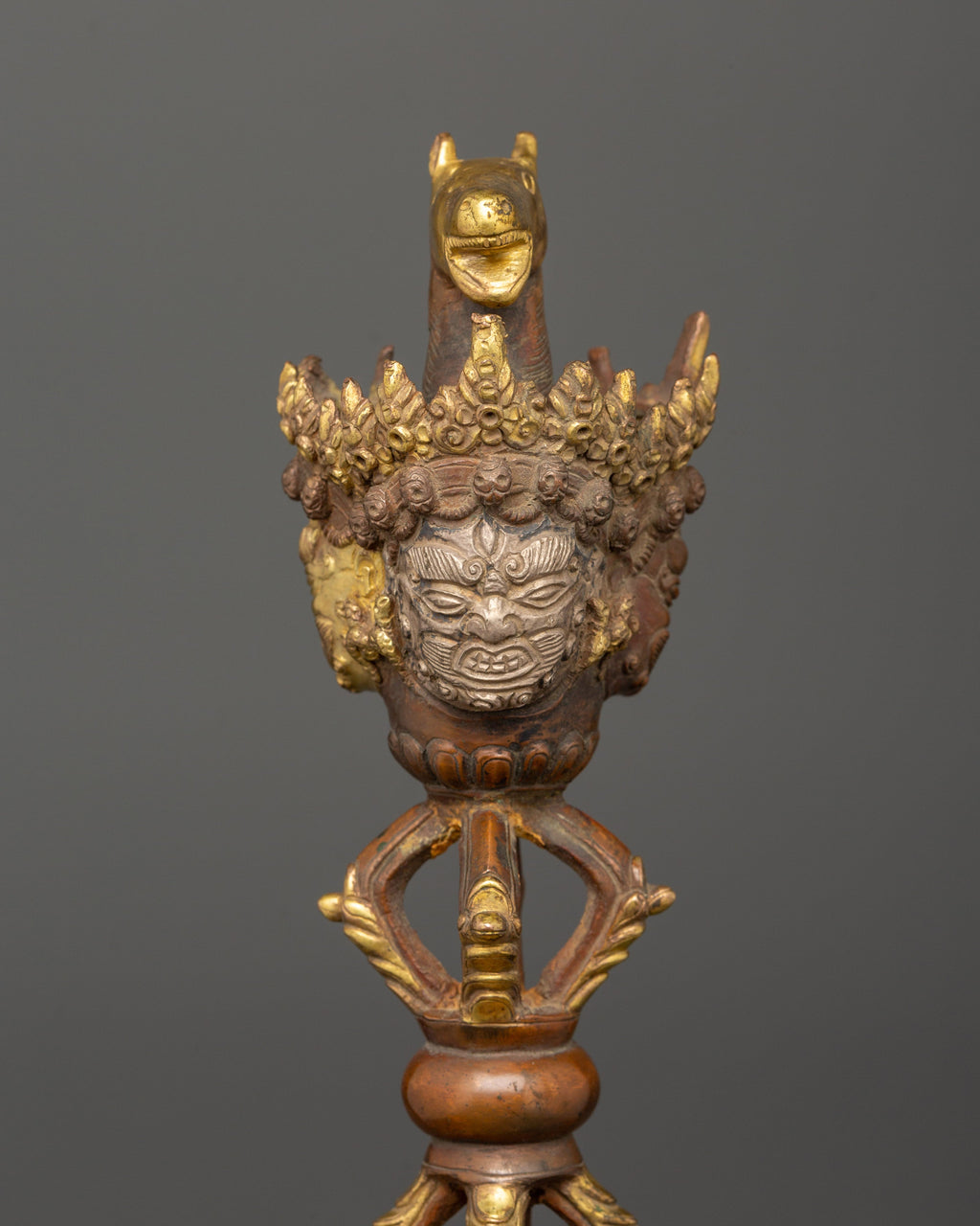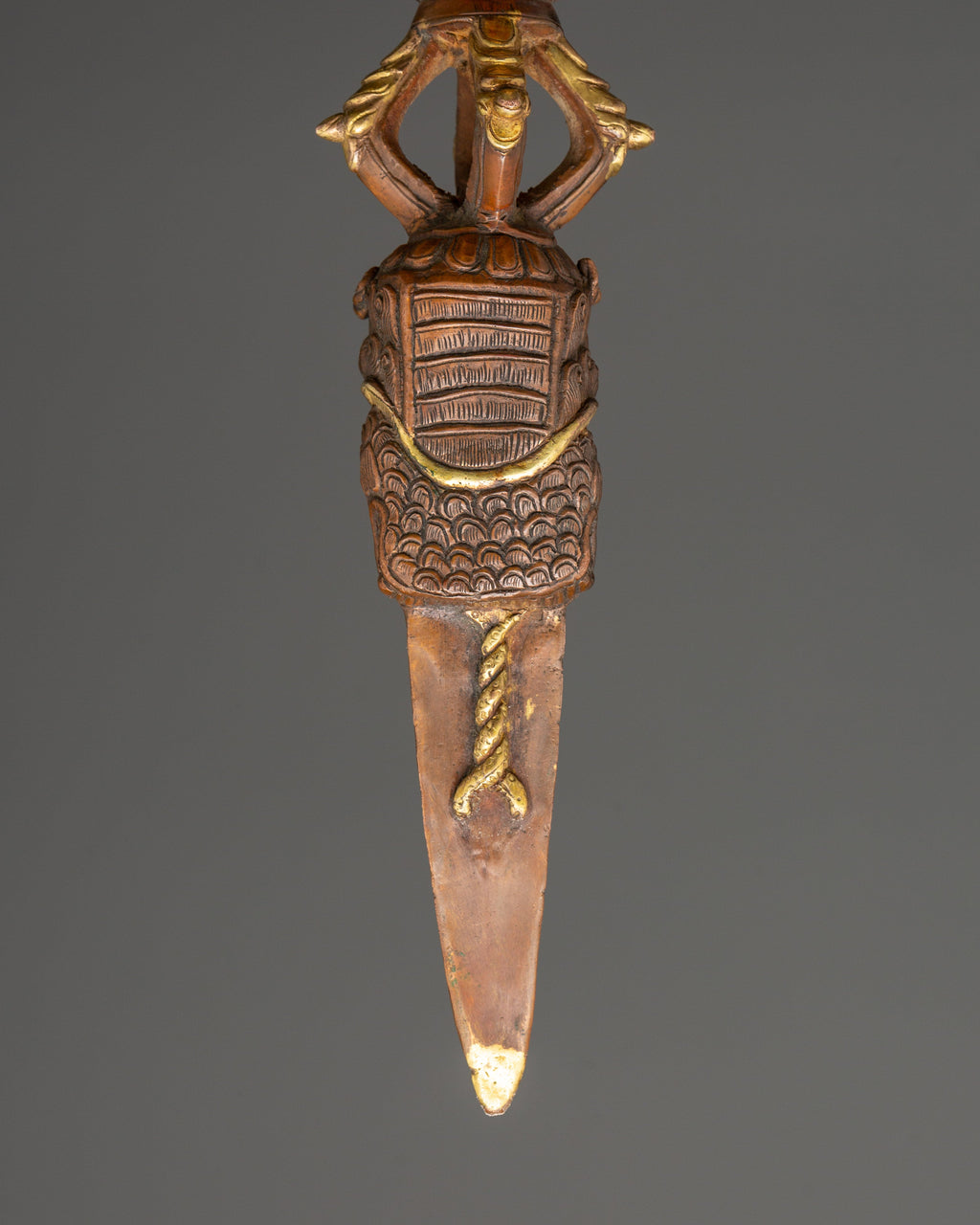 This traditional sacred Phurba dagger is a stunning Tibetan ceremonial item that offers spiritual protection and cleansing. Standing 36 cm tall, it is meticulously crafted from copper and gold-plated, providing an exquisite and striking appearance. The Phurba is used in Tibetan Buddhist rituals to symbolize removing negative energy and promoting healing and spiritual growth. Its intricate design, featuring symbolic engravings, enhances its spiritual significance.