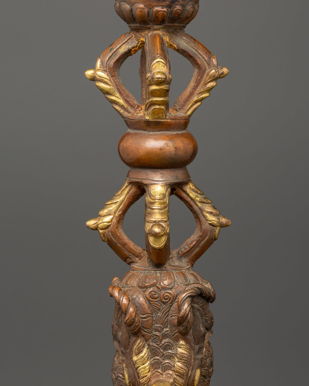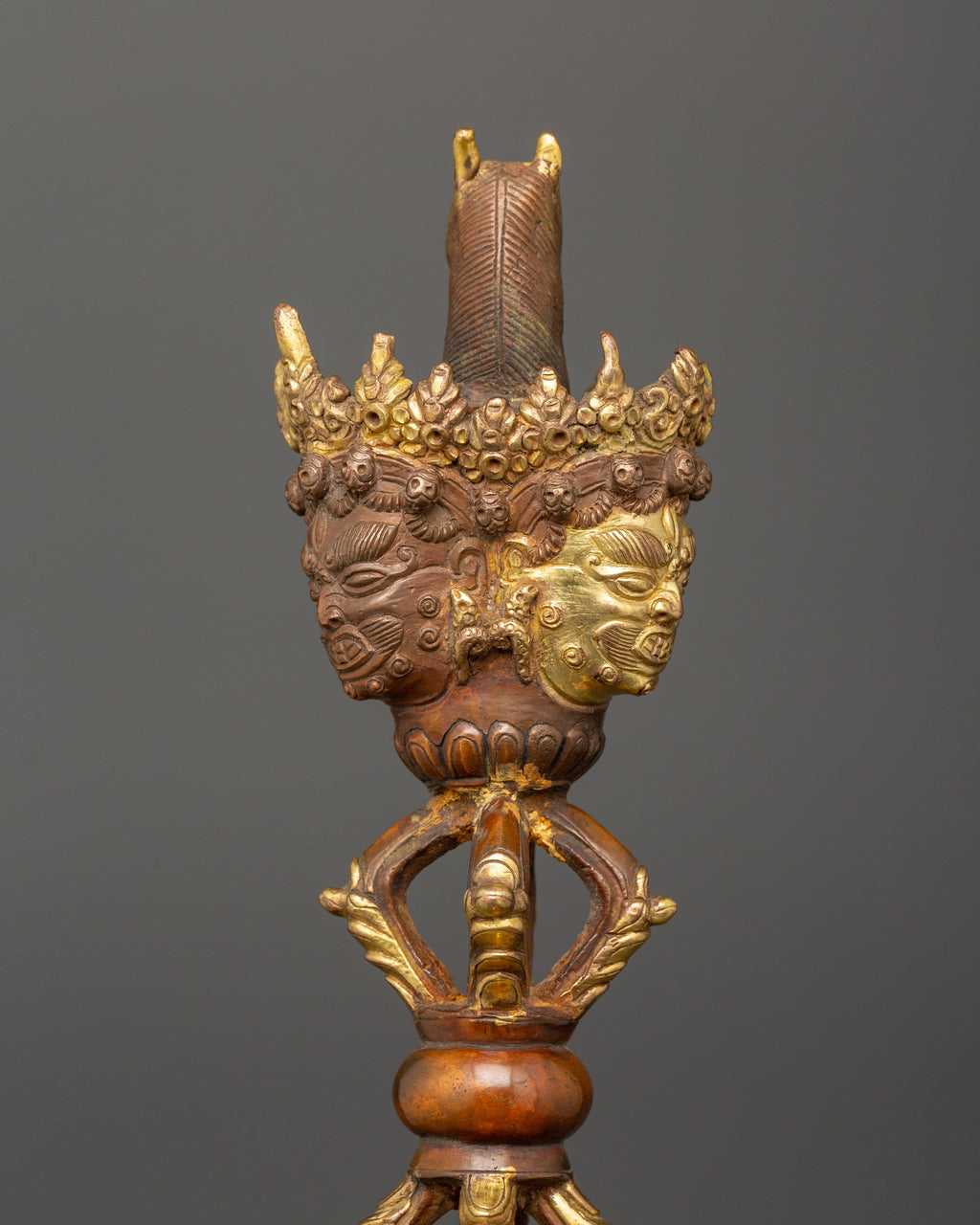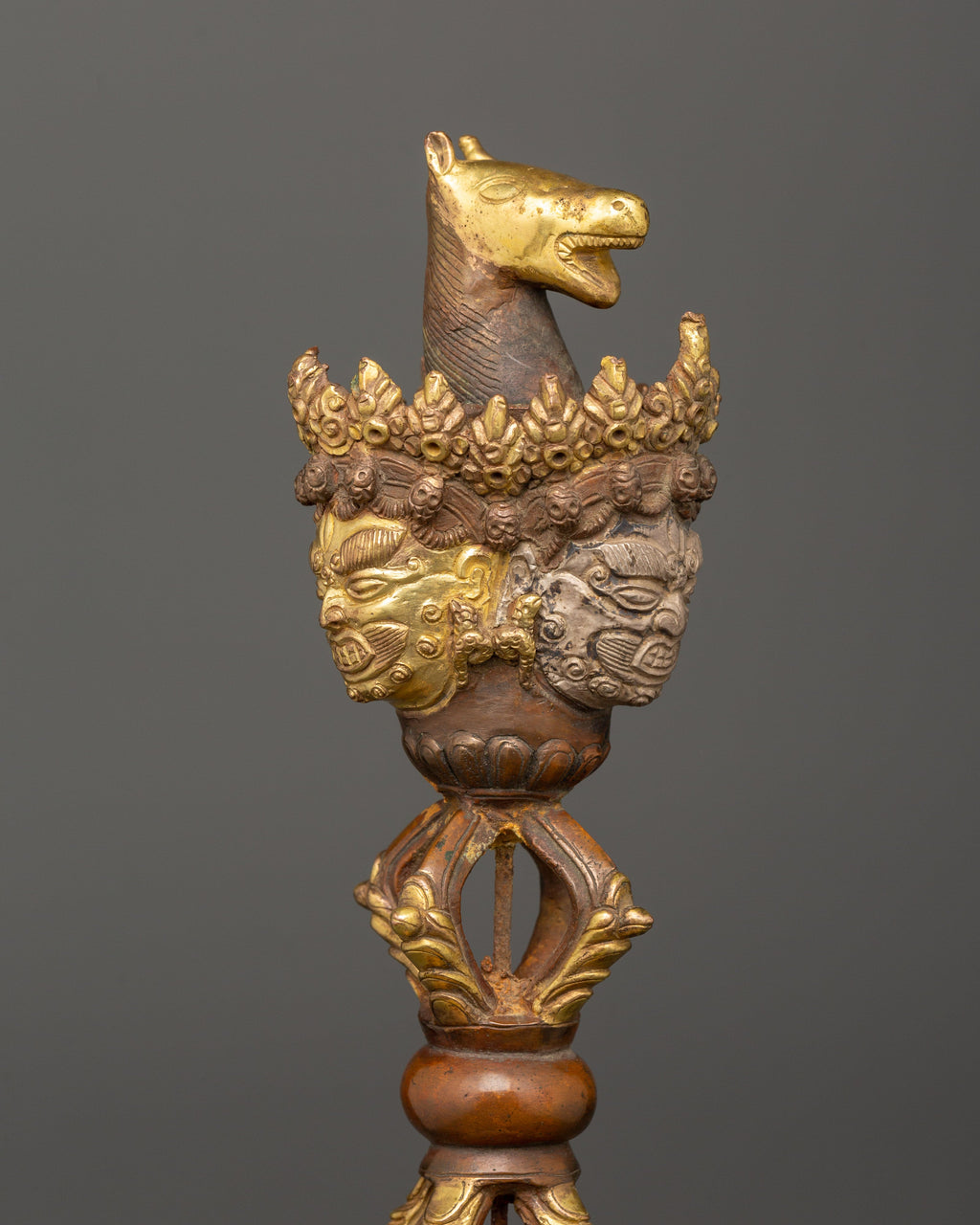 This traditional sacred Phurba dagger is a stunning Tibetan ceremonial item that offers spiritual protection and cleansing. Standing 36 cm tall, it is meticulously crafted from copper and gold-plated, providing an exquisite and striking appearance. The Phurba is used in Tibetan Buddhist rituals to symbolize removing negative energy and promoting healing and spiritual growth. Its intricate design, featuring symbolic engravings, enhances its spiritual significance.