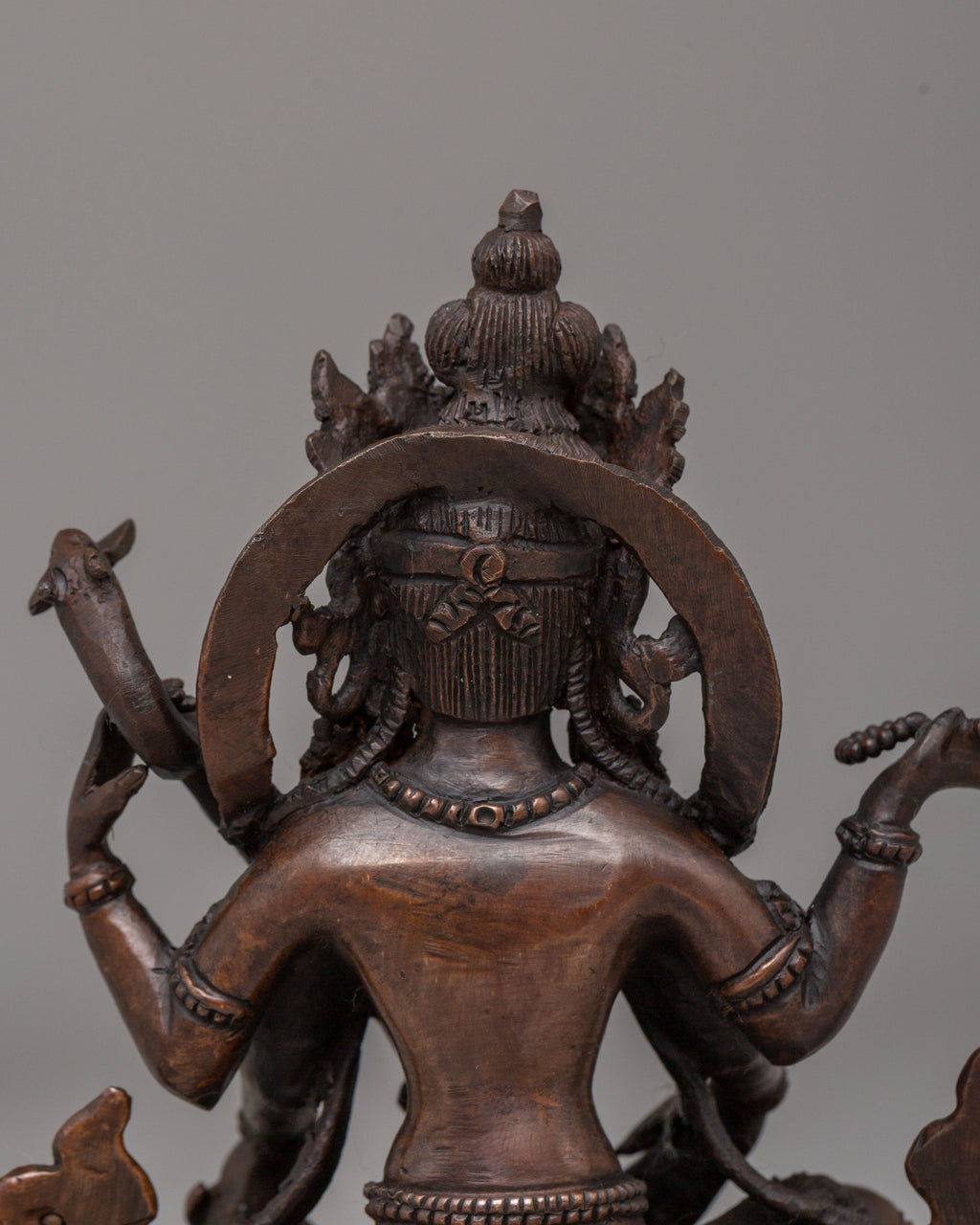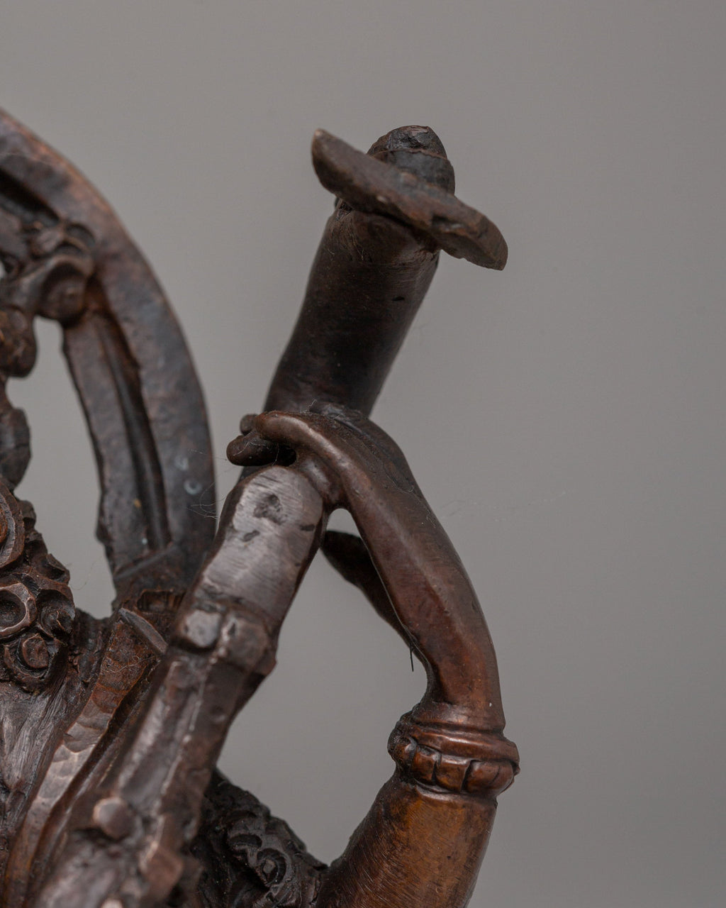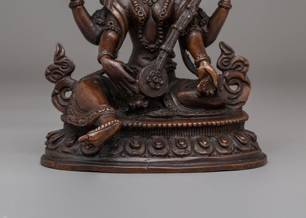 The oxidized copper finish enhances the intricate details of the deity’s graceful posture and sacred symbols. Saraswati is traditionally depicted holding the veena, symbolizing harmony and artistic expression, along with sacred texts representing knowledge and wisdom. Her serene expression reflects purity of thought and clarity of mind, while her seated posture signifies calm awareness and spiritual focus. The lotus base beneath her represents purity and enlightenment rising above worldly distractions.
