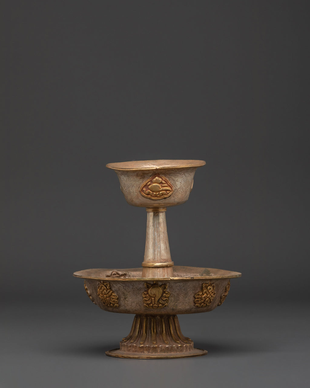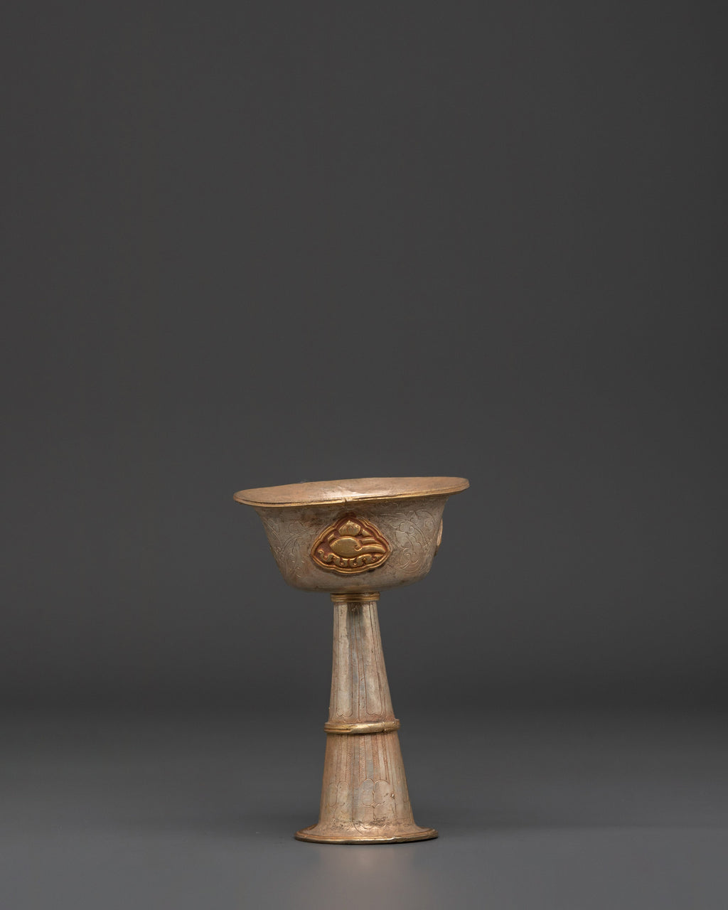 This traditional Serkyem set includes a lower offering bowl with a flared rim and a raised pedestal base, decorated with golden relief motifs symbolizing protection, abundance, and awakening. The upper cup, on a refined pillar stem, features gold-plated details and symbolic marks, suitable for pouring offerings like tea, alcohol, or sacred liquids during protector rituals. The Serkyem practice signifies deep commitment and swift enlightened activity, strengthening spiritual resolve, inviting protective forces, and improving Dharma practice.