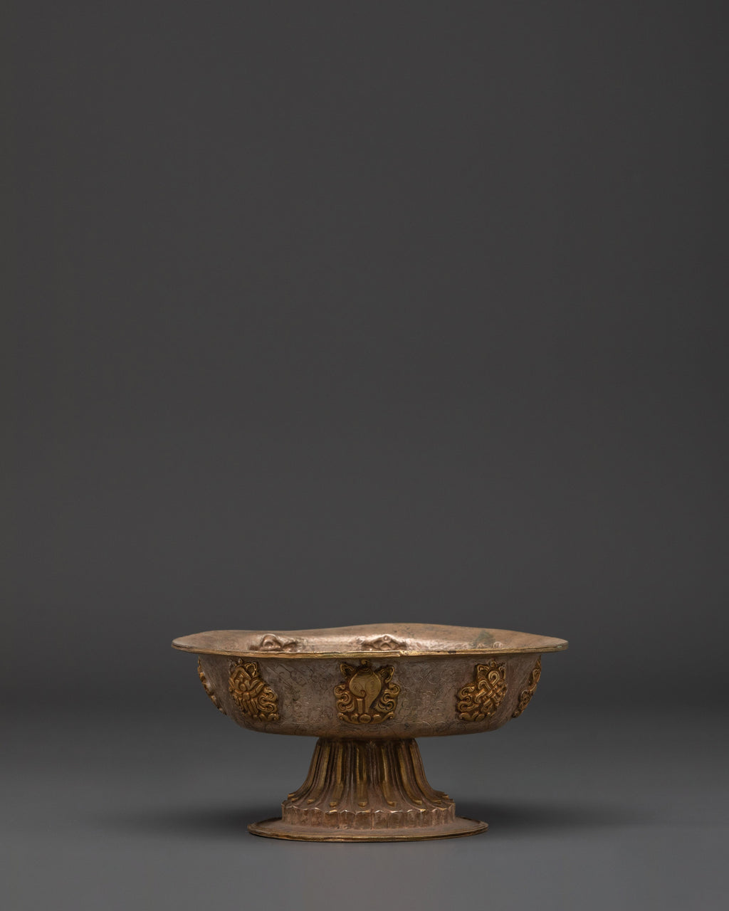 The Serkyem, a sacred offering vessel, is deeply embedded in Tibetan Buddhist rituals, representing both reverence and devotion. Used in ceremonies to offer drinks such as tea or butter to the divine, the Serkyem symbolizes purity and spiritual connection. Its ornate design, often adorned with gold and silver, reflects the profound respect given to these sacred acts. As the Serkyem is placed on an altar or offered during prayers, it serves as a reminder of the importance of generosity, gratitude, and the bond between the material and spiritual worlds. Each offering made with the Serkyem is an act of devotion, a step toward cultivating inner peace and aligning with the teachings of Buddhism.
