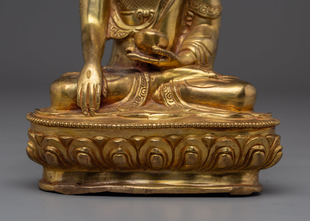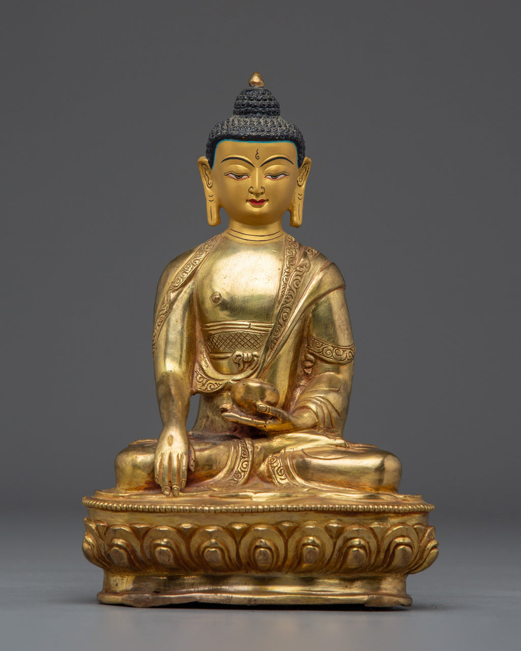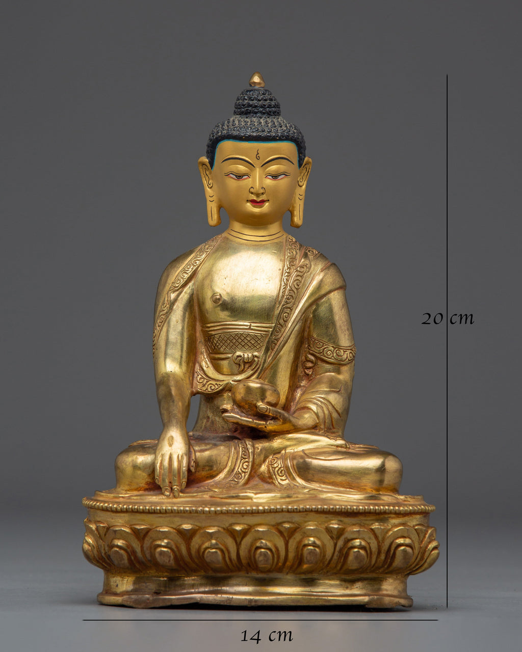 This Shakyamuni Buddha statue, known as the "Sage of the Shakya Clan," portrays the historical Buddha in a moment of serene enlightenment beneath the Bodhi tree. He represents purity and spiritual awakening in the Vajra posture (Padmasana) on a lotus base. His right hand is extended toward the earth in the Bhumisparsha Mudra, inviting the world to witness his enlightenment. His left hand holds an alms bowl in his lap, symbolizing renunciation. The ushnisha atop his head signifies wisdom, and the spiral curls covering his head are said to represent the snails that protected him from the scorching sun during his meditation, an emblem of selfless devotion and nature’s reverence. His serene face reflects inner peace and deep meditation. This elegantly crafted statue embodies tranquility, spiritual growth, and enlightenment, making it a perfect addition to meditation spaces, altars, or any place of contemplation.