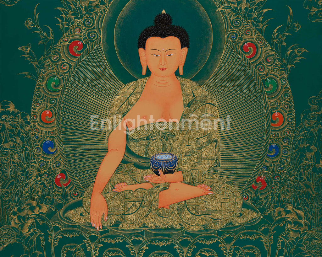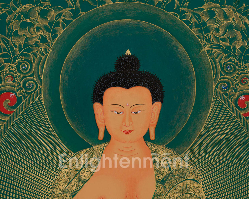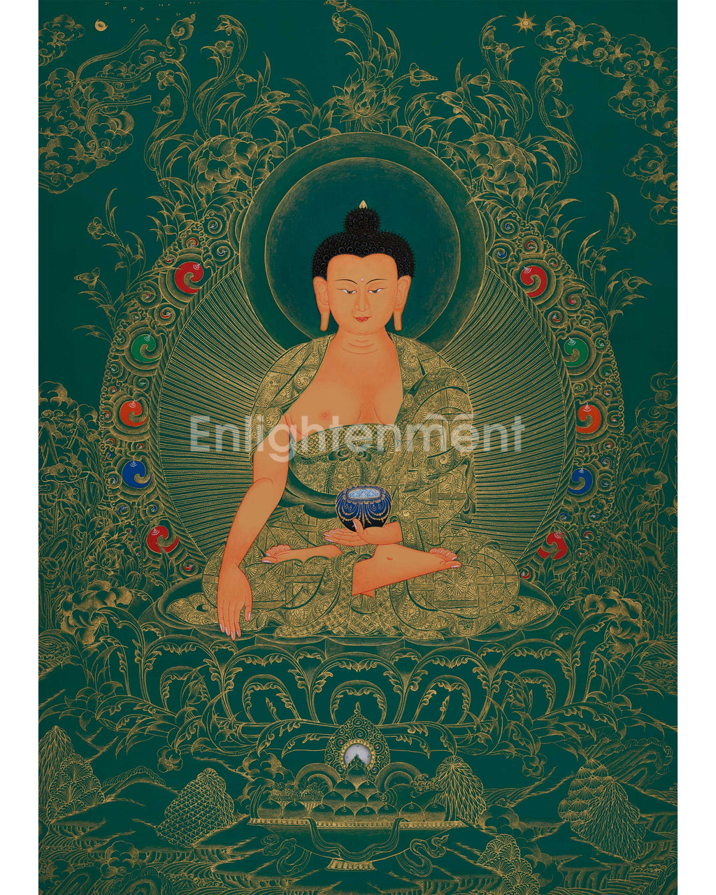 This Traditional Shakyamuni Buddha Artwork depicts Siddhartha Gautama, the historical Buddha, sitting in tranquil meditation on a lotus seat. This magnificent Thangka is delicately hand-painted on cotton canvas, demonstrating a traditional artistic style passed down through generations. The artist has skillfully rendered the Buddha's vivid portrayal using acrylic colors, enhancing the composition with rich, intricate strokes. The genuine 24K gold is expertly blended with the green backdrop to produce a captivating look that heightens the piece's spiritual atmosphere. This golden blend enhances the artwork's brilliance by adding a sense of peace and divine light. This Thangka's skilled work ensures longevity and visual impact, resulting in a magnificent and essential piece.