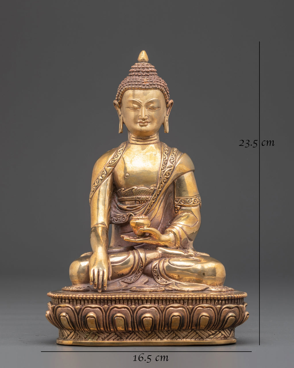 Bring serenity, wisdom, and spiritual clarity into your house with the Traditional Shakyamuni Buddha Figurine, a beautifully crafted representation of the historical Buddha. This figure, crafted from copper and embellished with beautiful gold plating, exemplifies spiritual creativity with Buddhist roots. The Buddha is seen in intense meditation, with his right hand making the earth-touching motion (Bhumisparsha mudra), which represents his moment of enlightenment under the Bodhi tree.