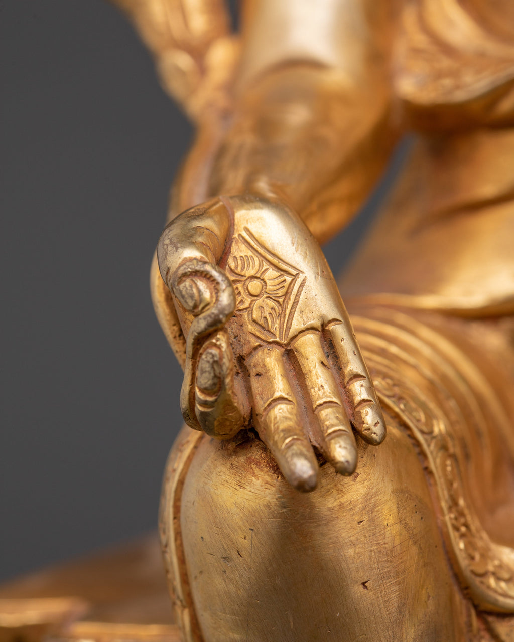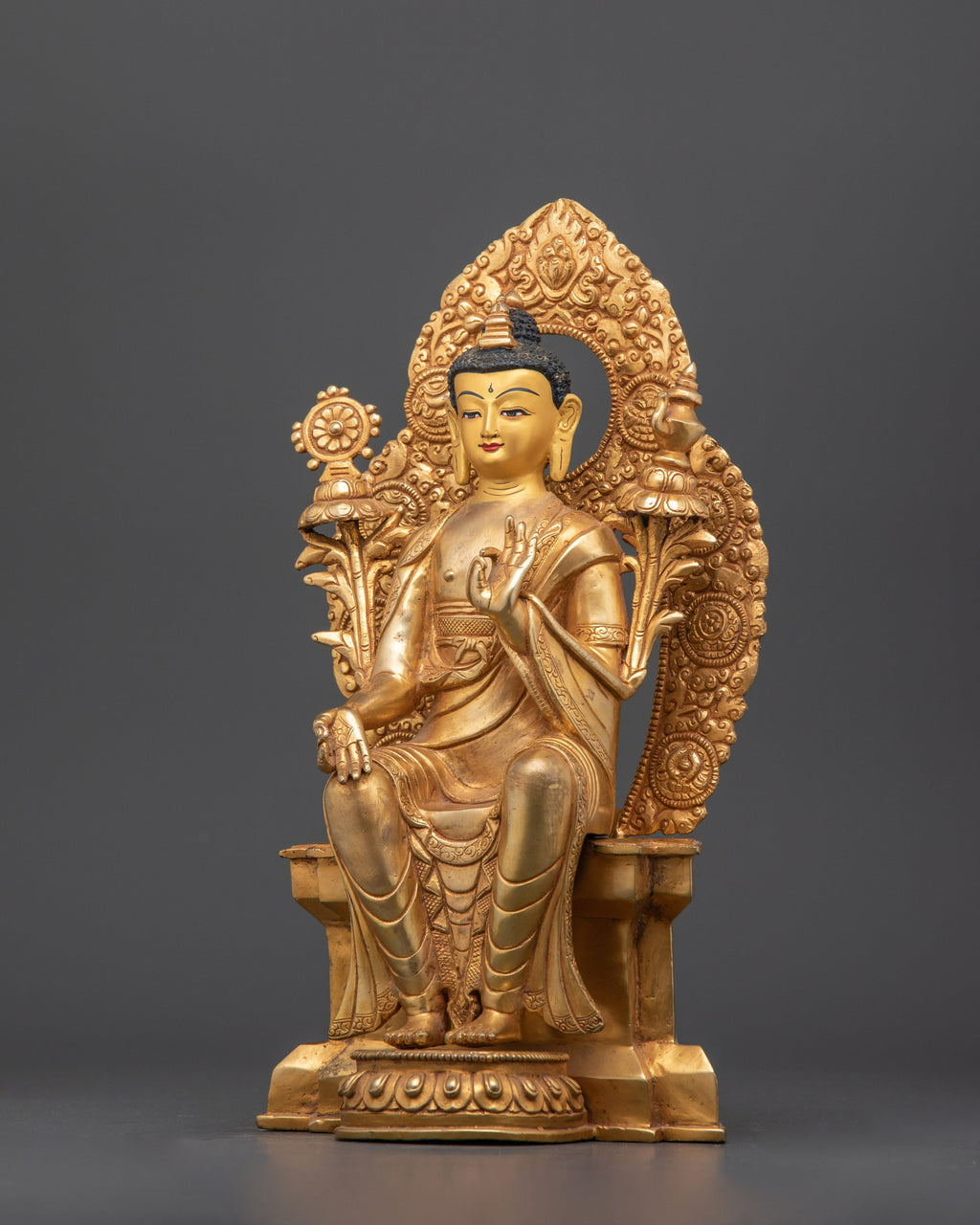 Maitreya is portrayed in this statue sitting in a calm and composed position, representing his function as a peacemaker and teacher. His left hand is softly resting on his knee, which stands for knowledge and enlightenment, while his right hand is uplifted in the brave abhaya mudra gesture, signifying protection and certainty.
