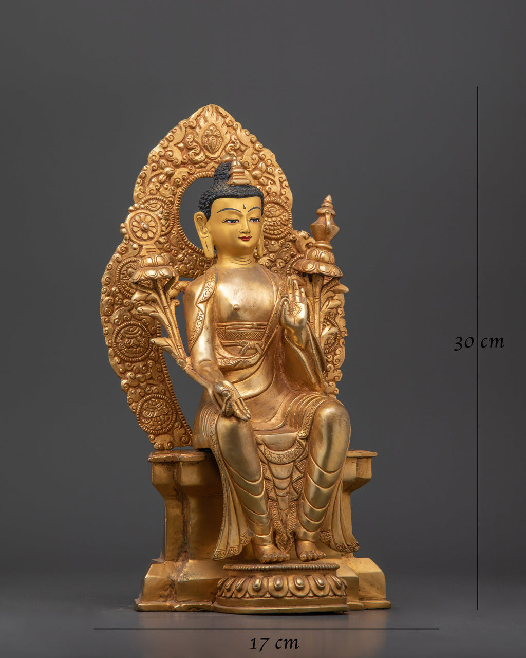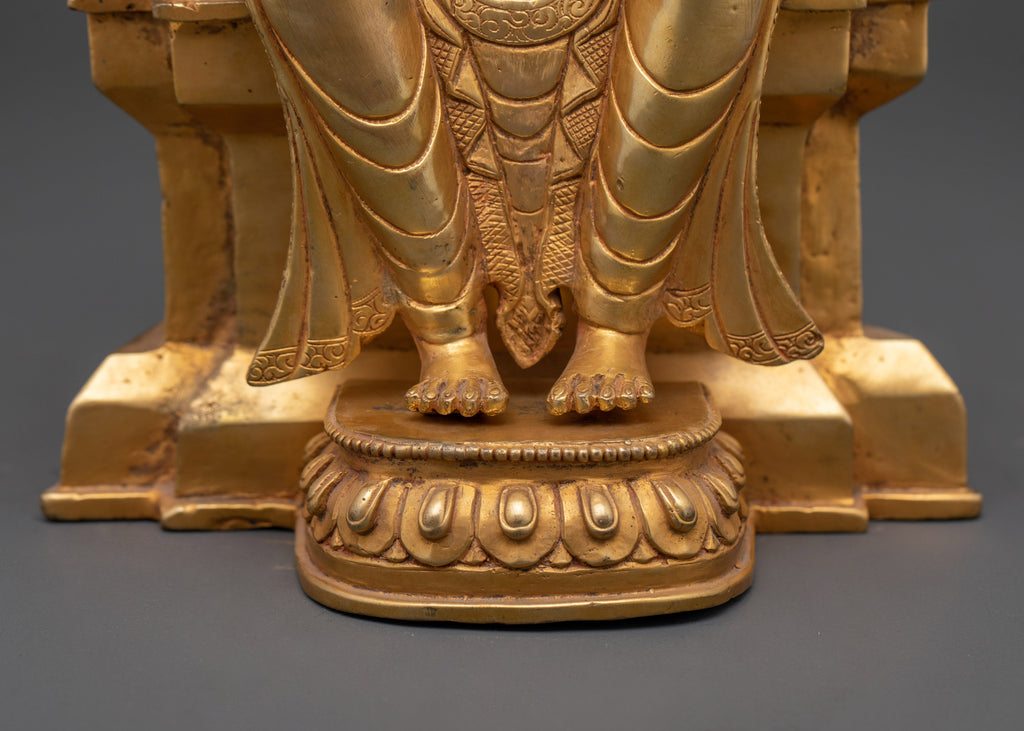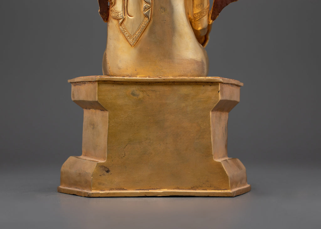 The statue captures the holy presence of Spiritual Maitreya Buddha, the Buddha of the future, with gold and acrylic paints paired with 24K gold plating. This monument symbolizes Maitreya's function as the hope and enlightenment-bringing figure of the future by capturing his calm and caring presence. The deity's kind attributes are emphasized by the intricate carvings and brilliant gold finish, which make it a stunning addition to any area looking to instill calm and good vibes.