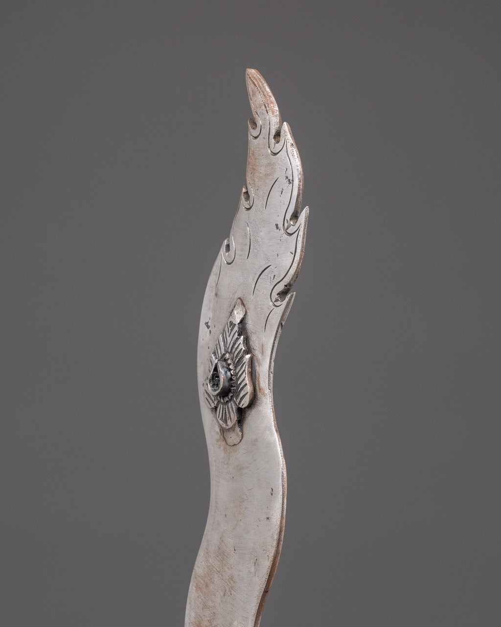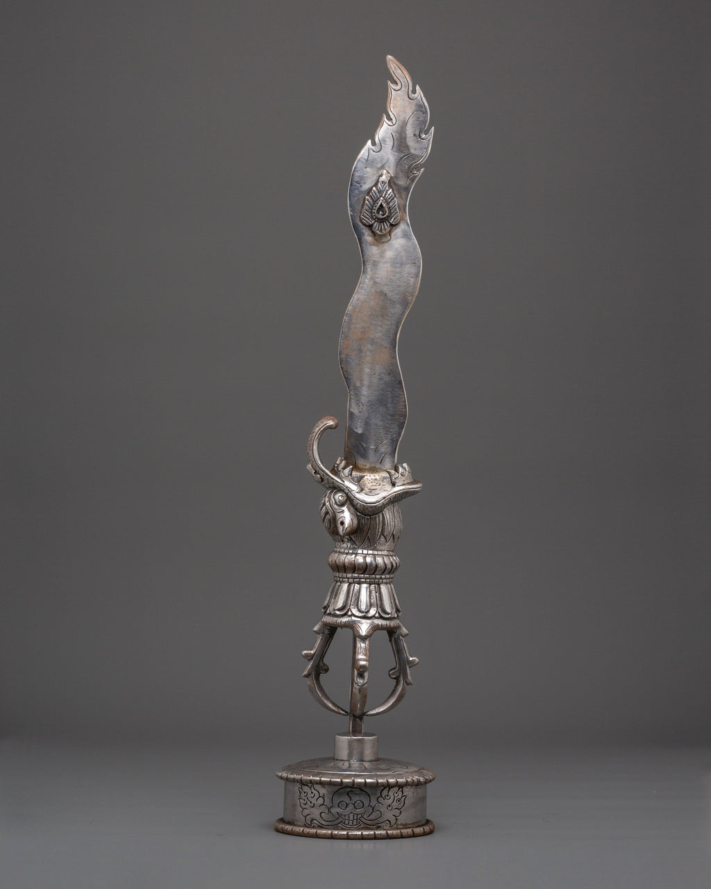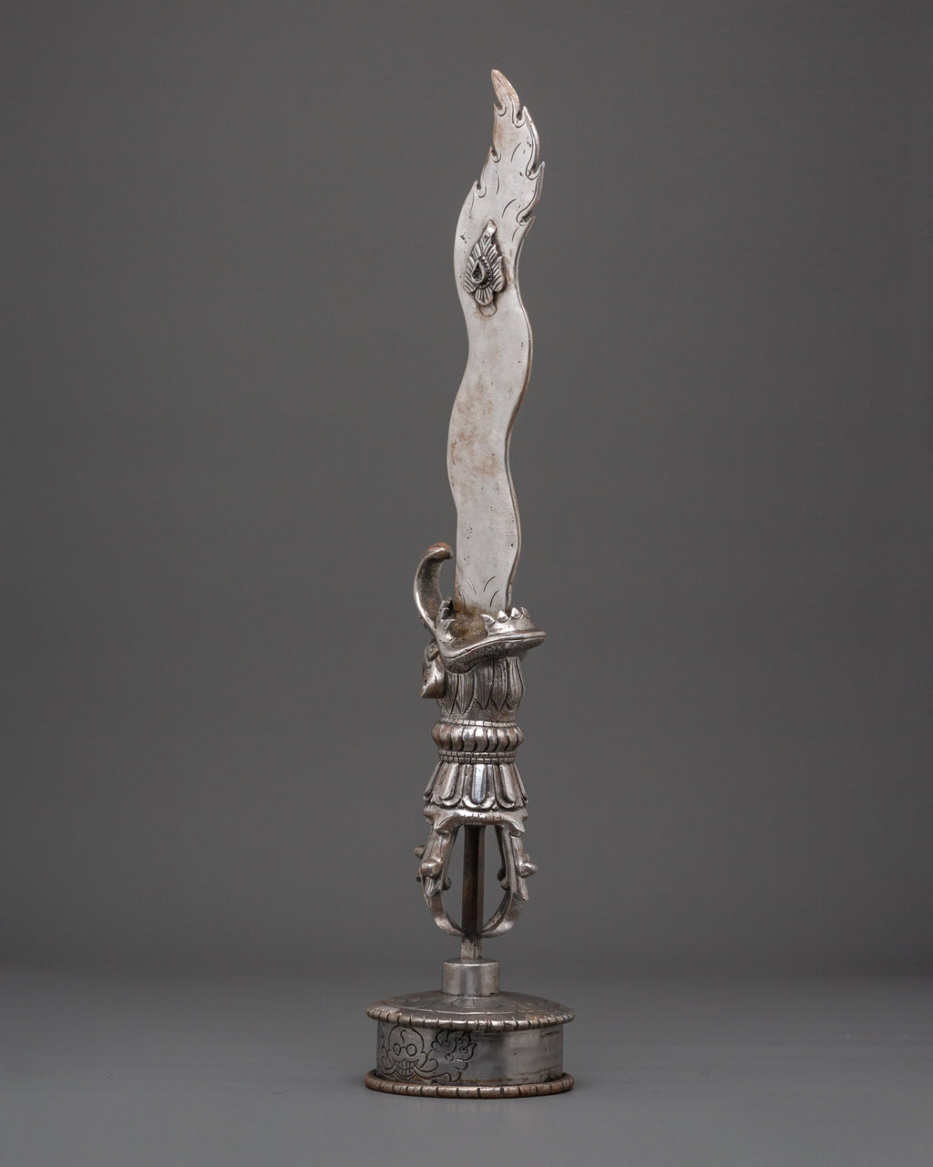 The motifs etched along the blade and handle are deeply rooted in ancient traditions, symbolizing the connection between the physical and spiritual realms. The flame-like tip of the sword signifies transcendence, while the overall design reflects a desire for inner peace. This weapon stands not only as a tool but as a powerful emblem of spiritual strength, inviting those who seek enlightenment and growth to wield it in their personal journey.